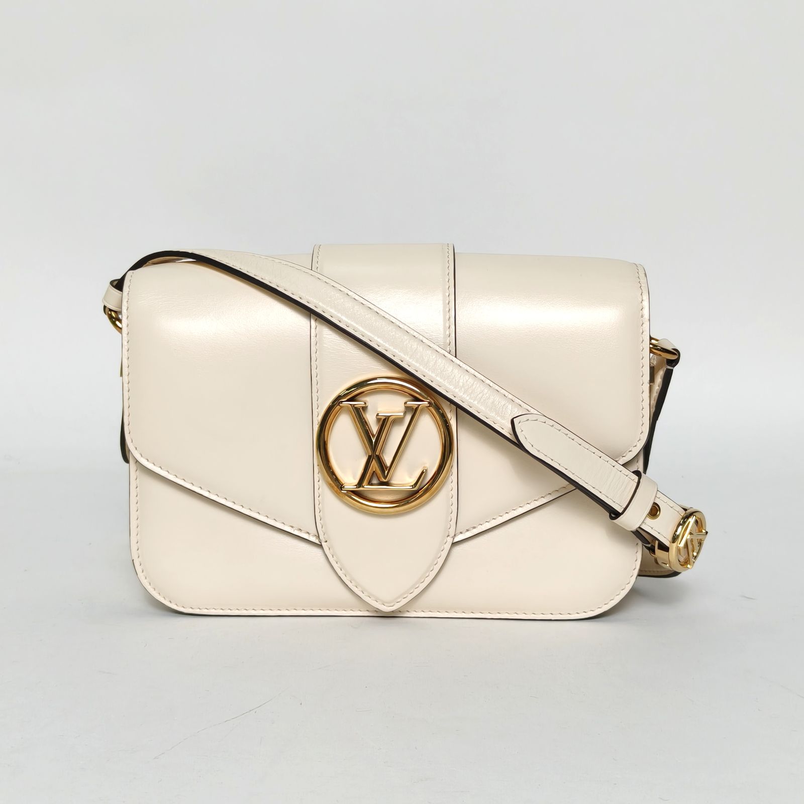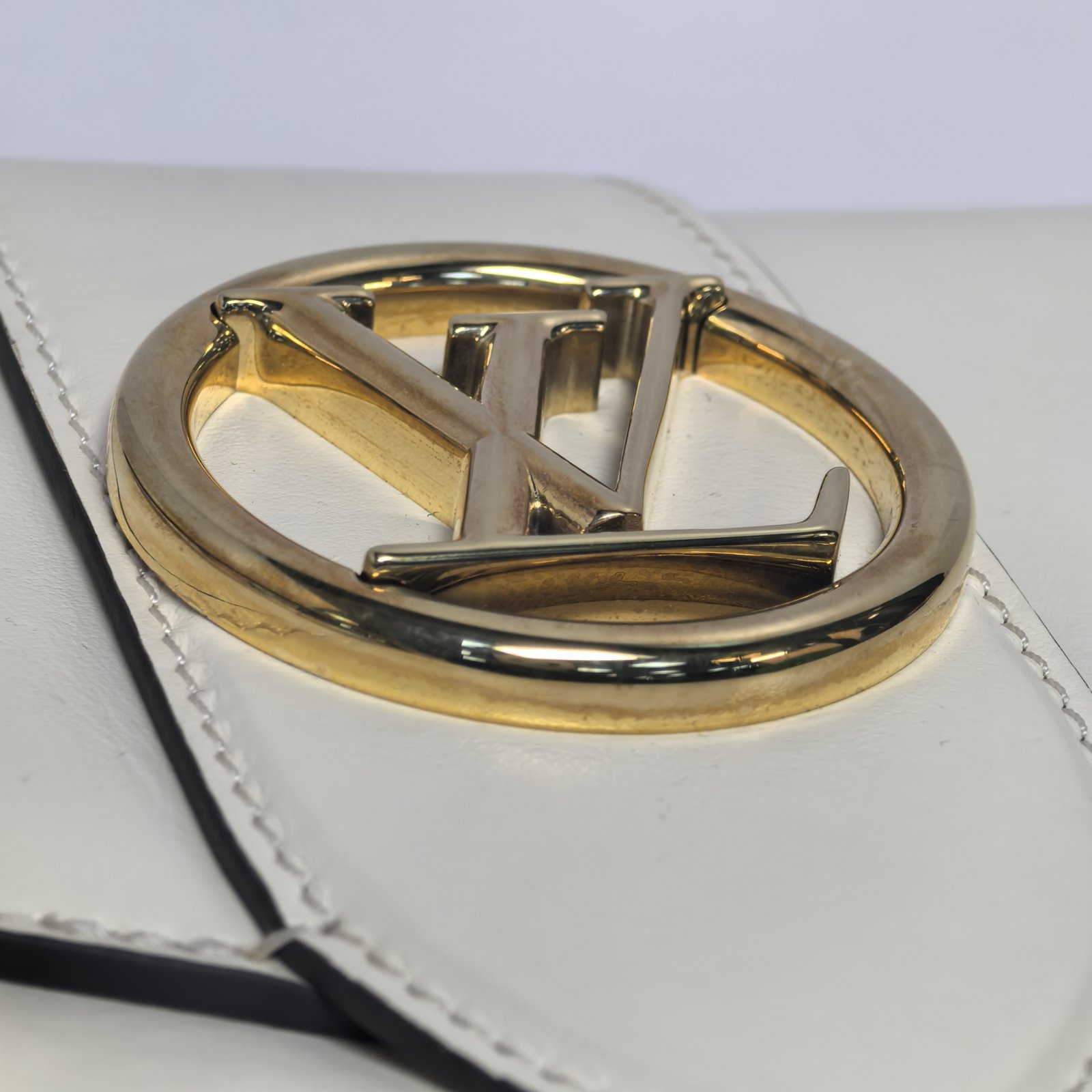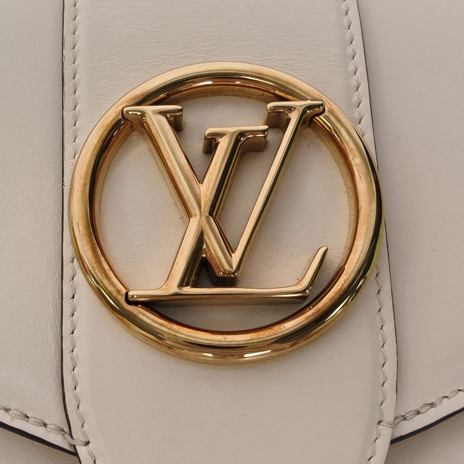 Embodying a minimalist and elegant luxury shoulder bag, the LV Pont 9 is crafted from off-white leather with circular LV logo and adjustable shoulder strap.
