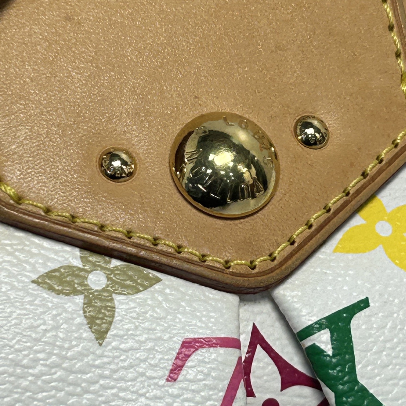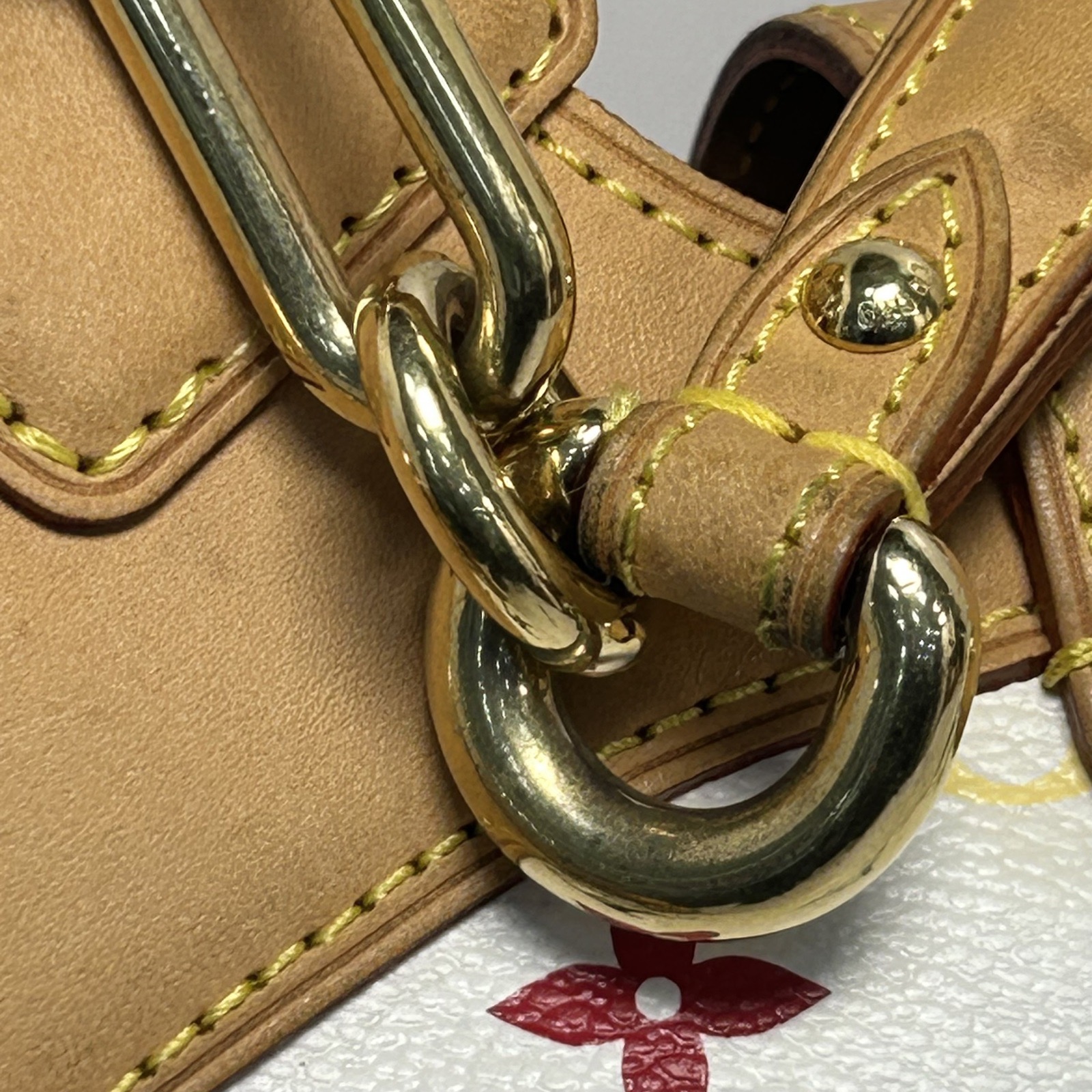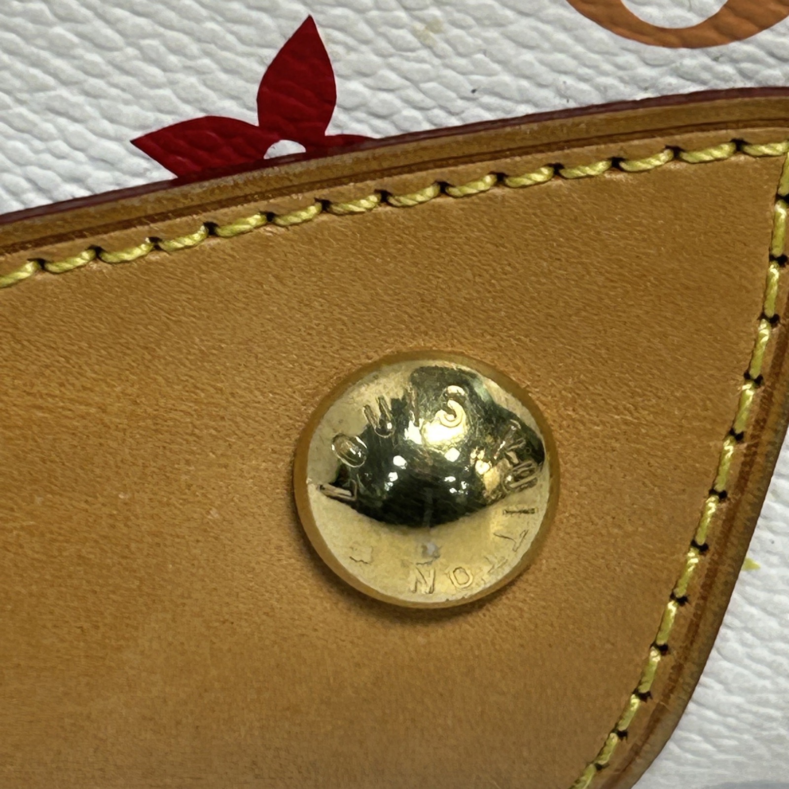 This vintage Louis Vuitton Usula handbag is made of white multicolor monogram PVC with tan leather trim, featuring a playful multicolor LV monogram pattern.