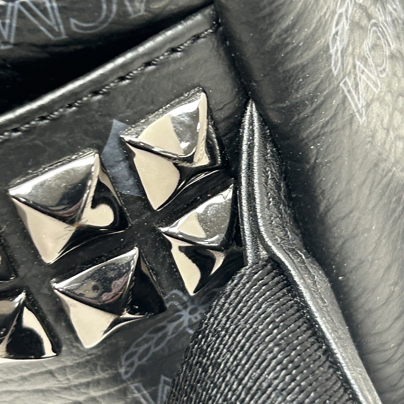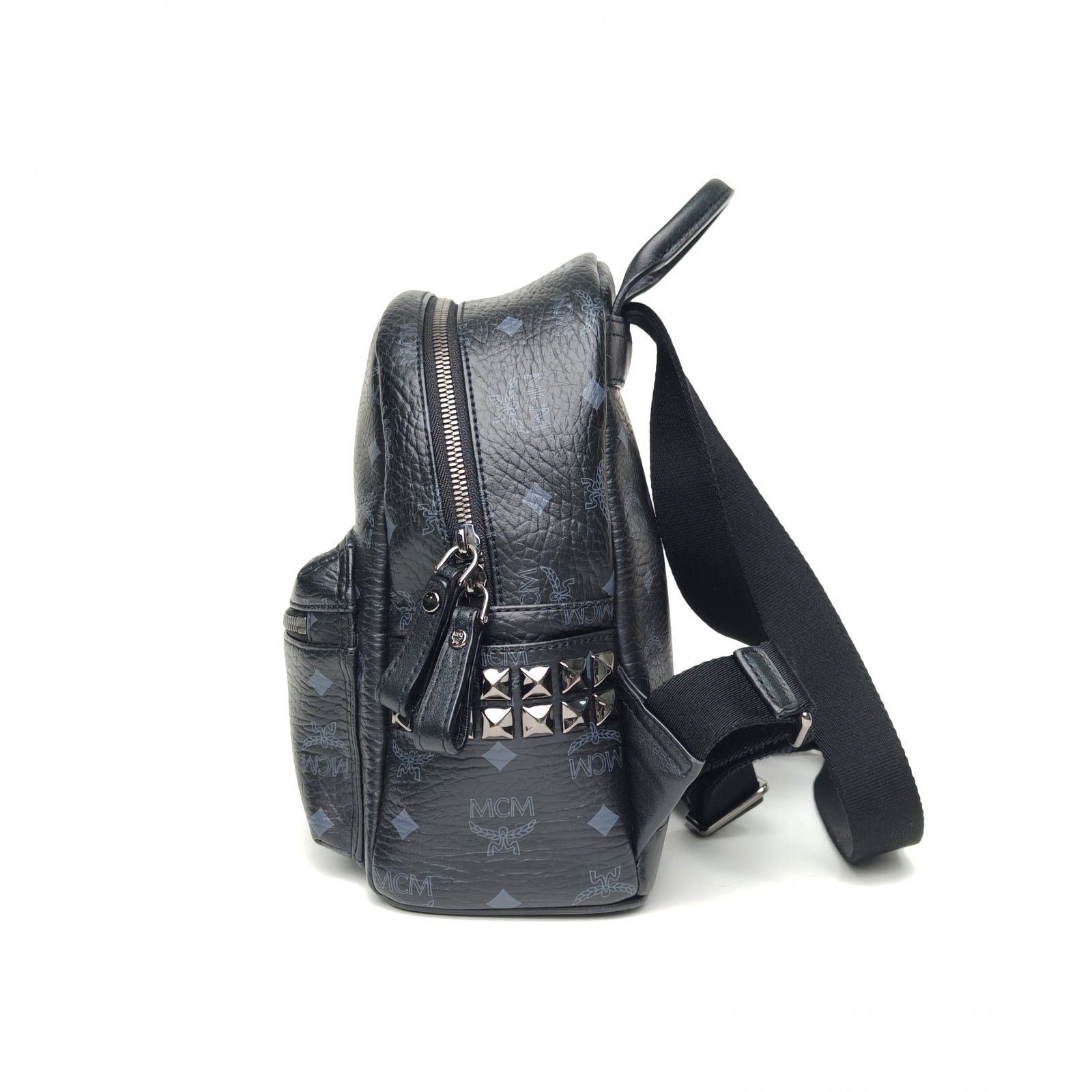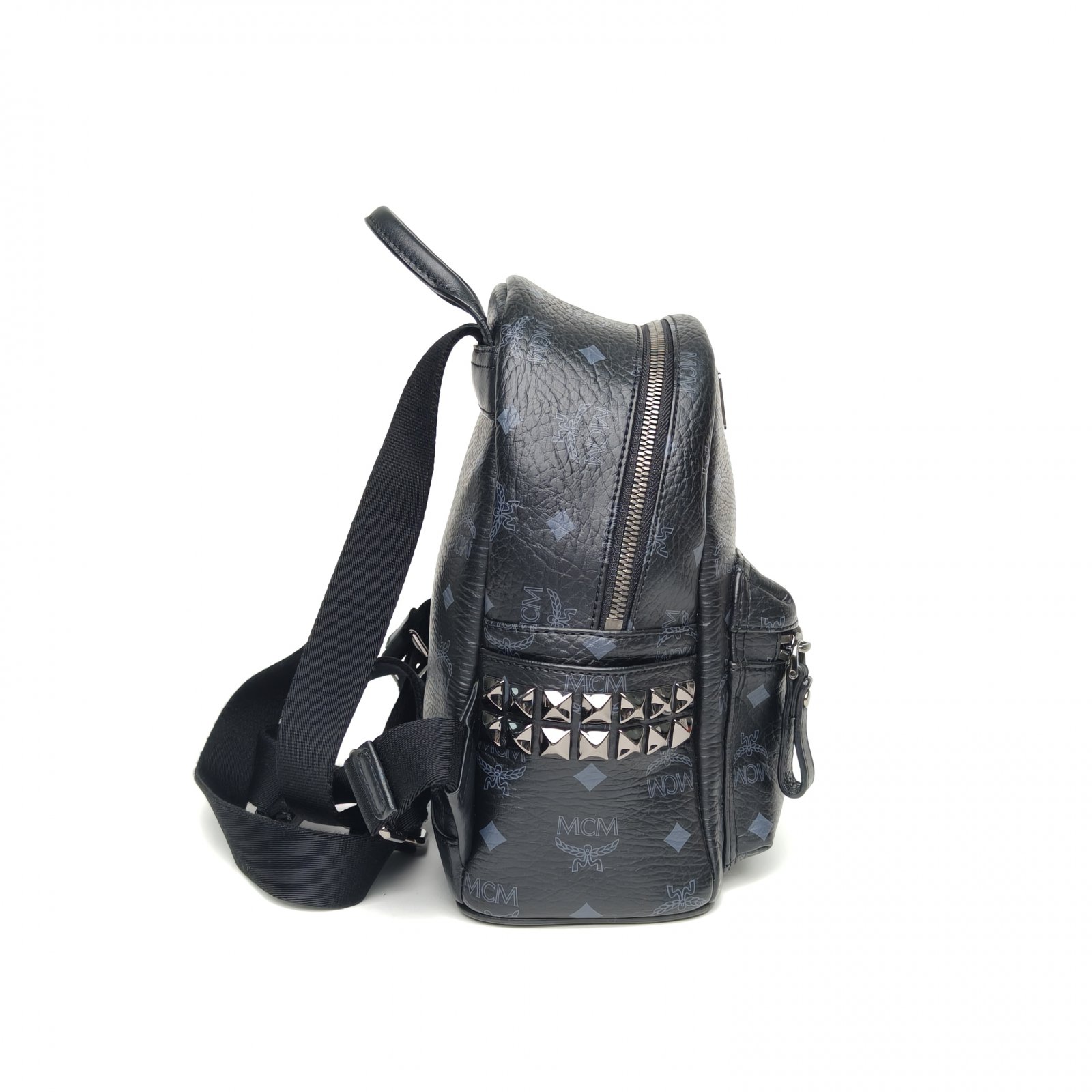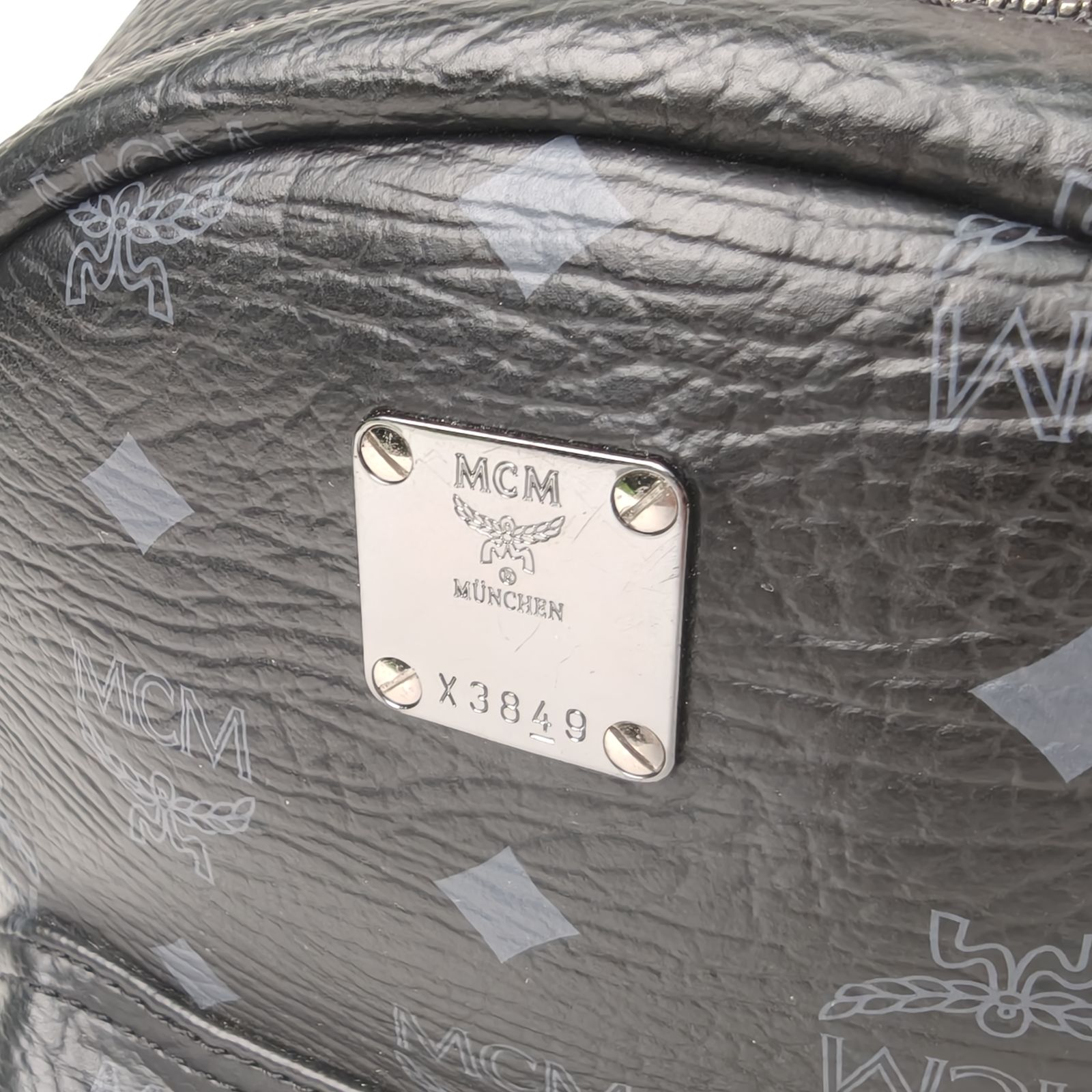 Made from black leather with embossed MCM monogram and side rivet details, this mini backpack features adjustable straps and a compact shape, perfect for trendy hands-free carry.