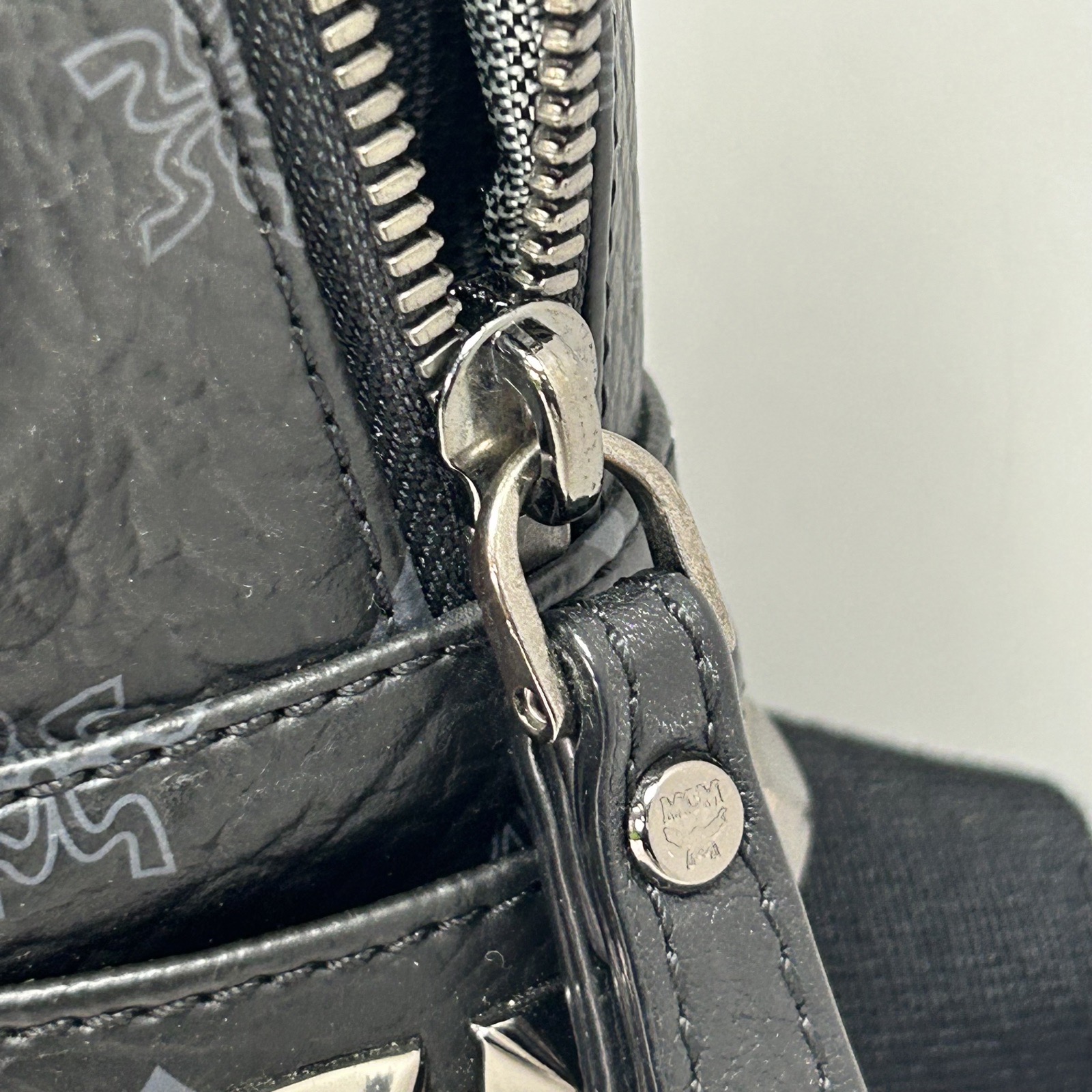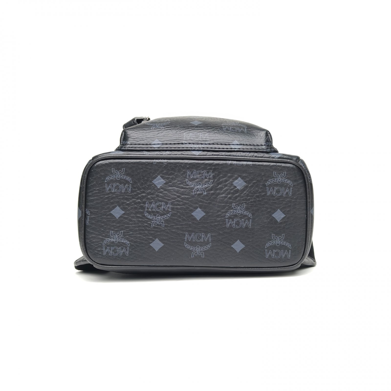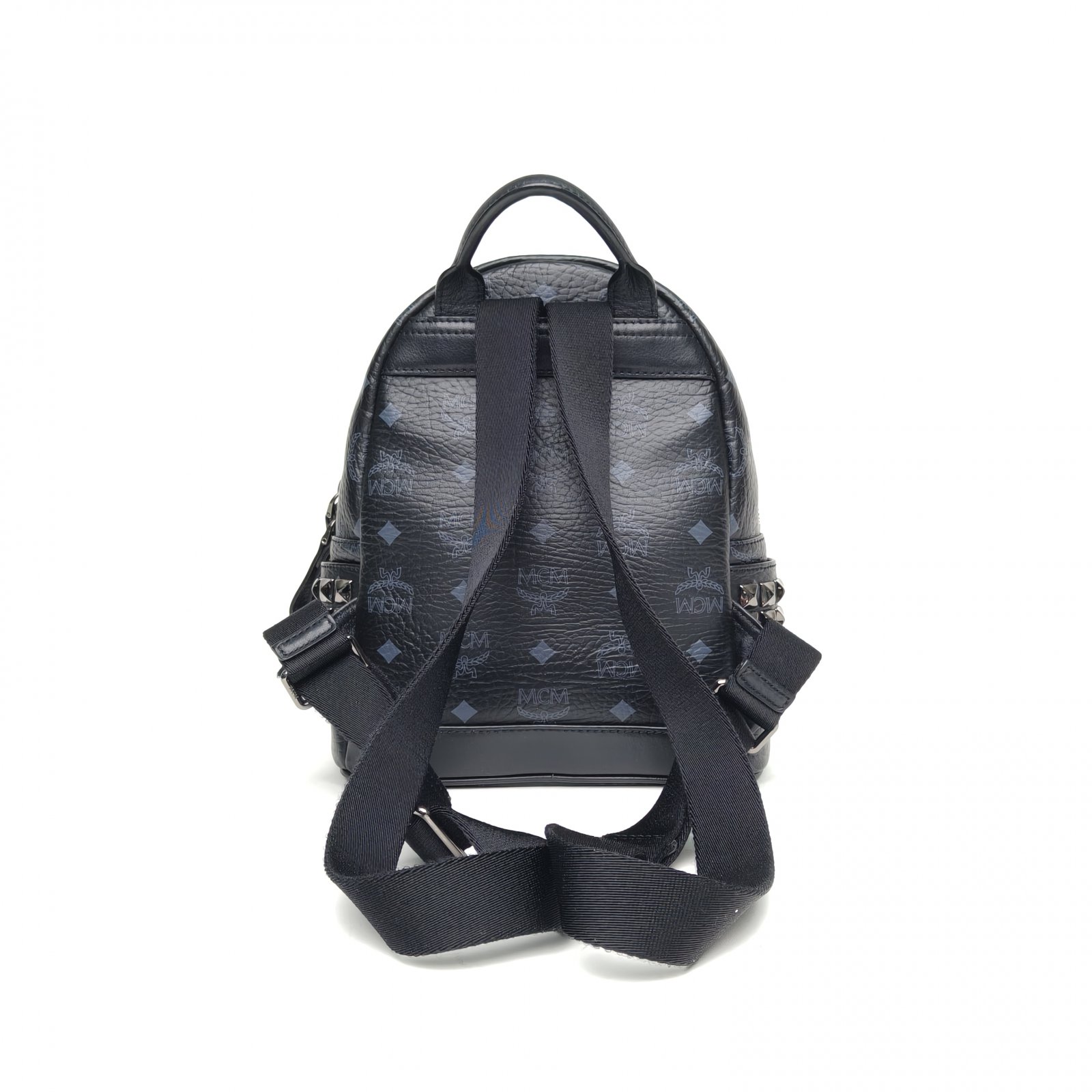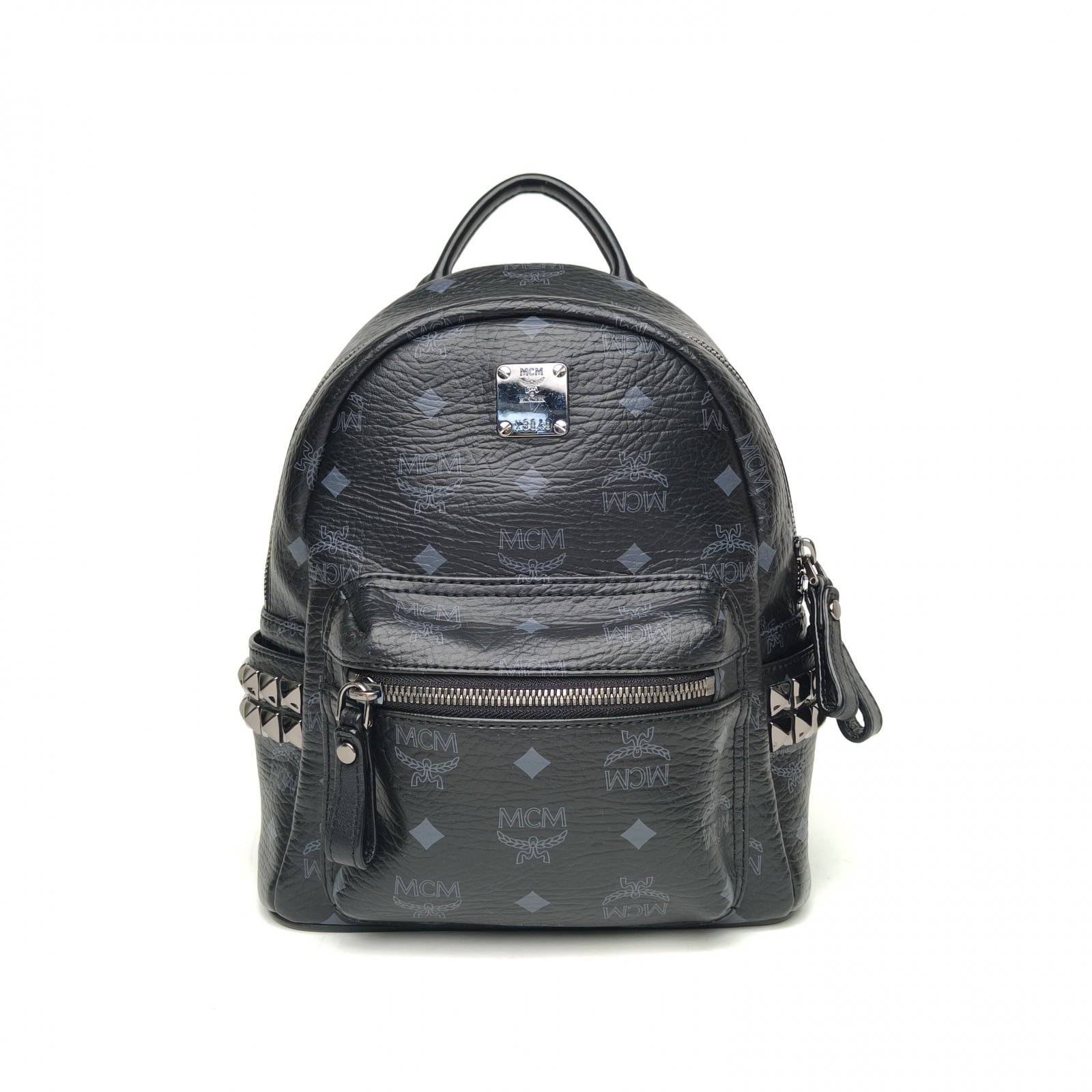 Made from black leather with embossed MCM monogram and side rivet details, this mini backpack features adjustable straps and a compact shape, perfect for trendy hands-free carry.