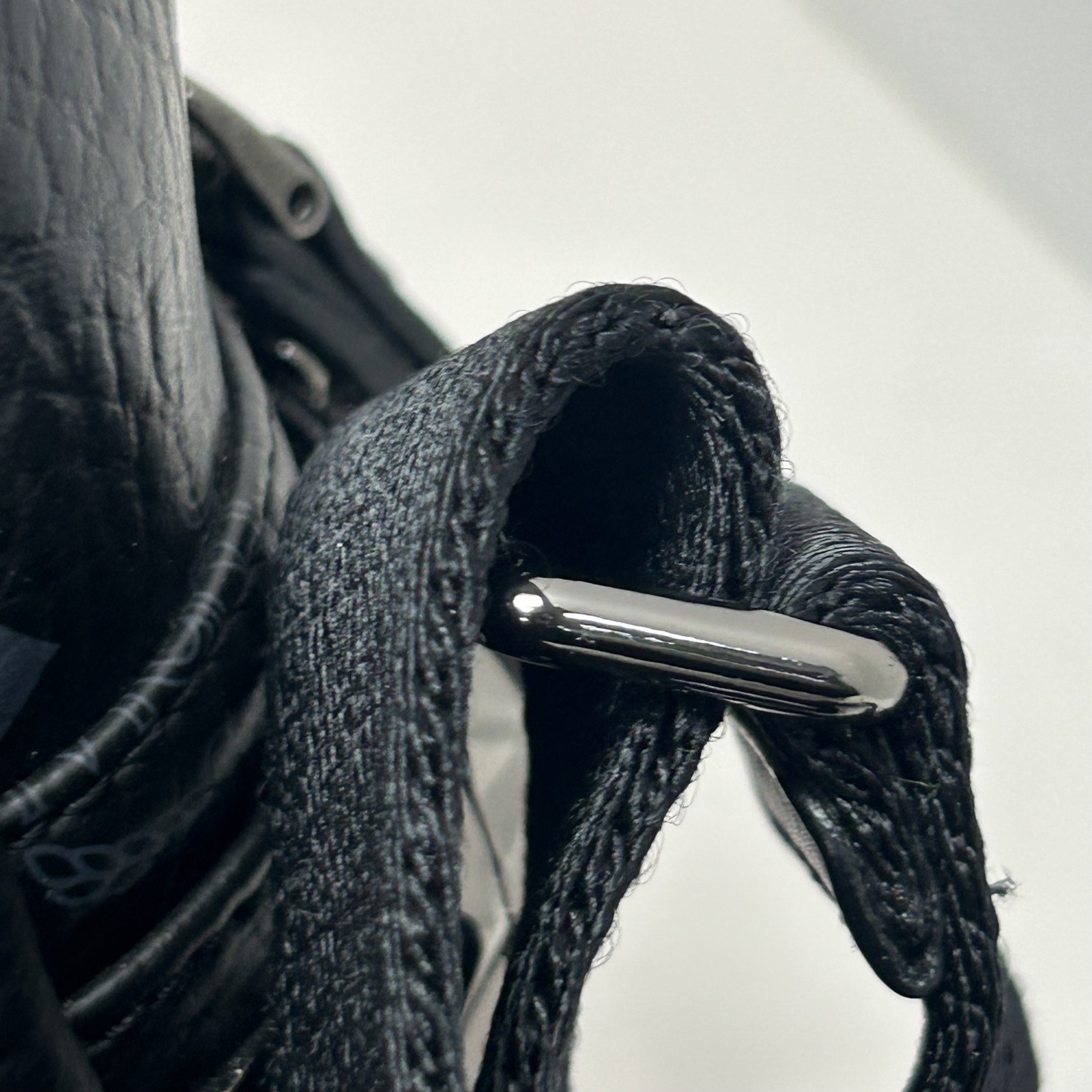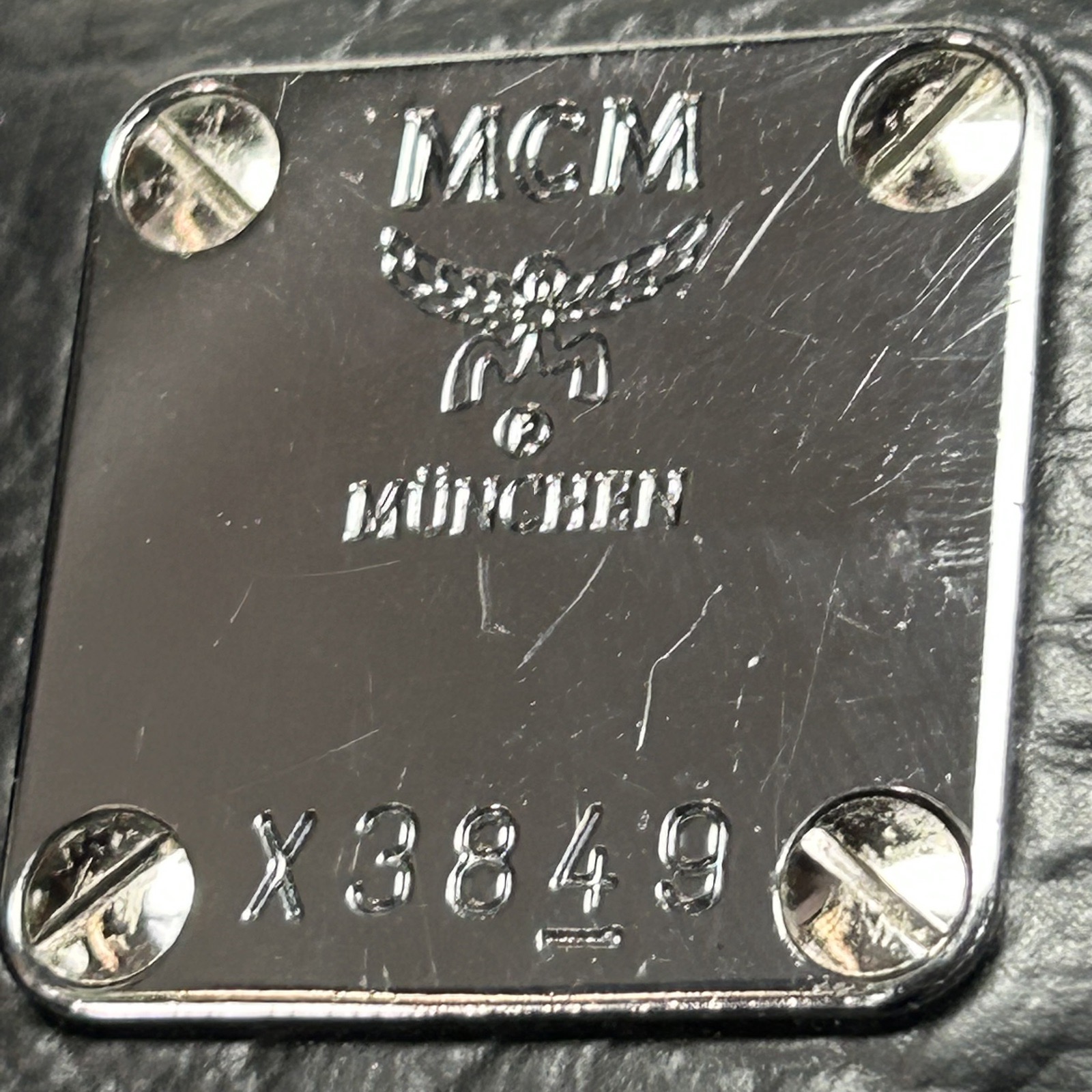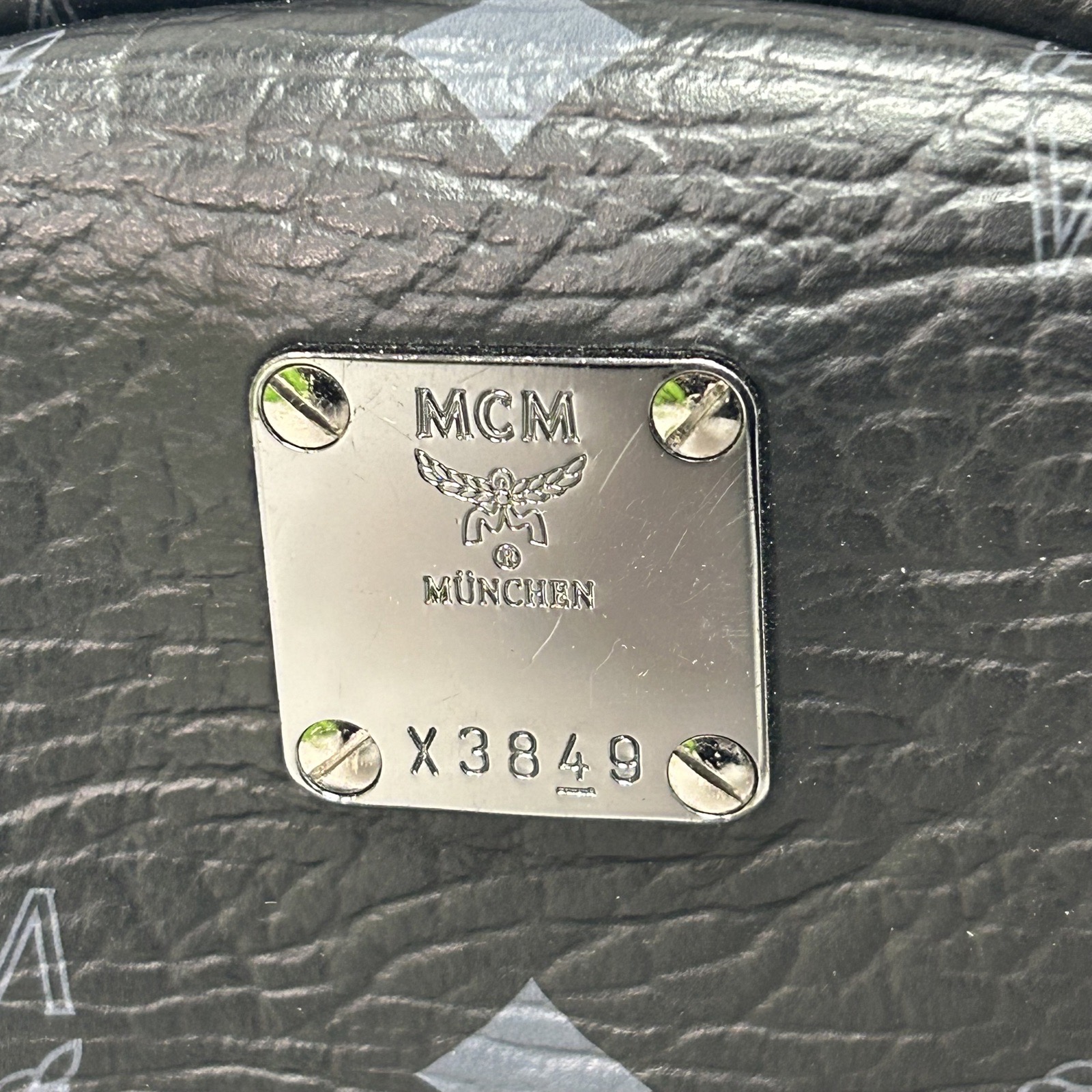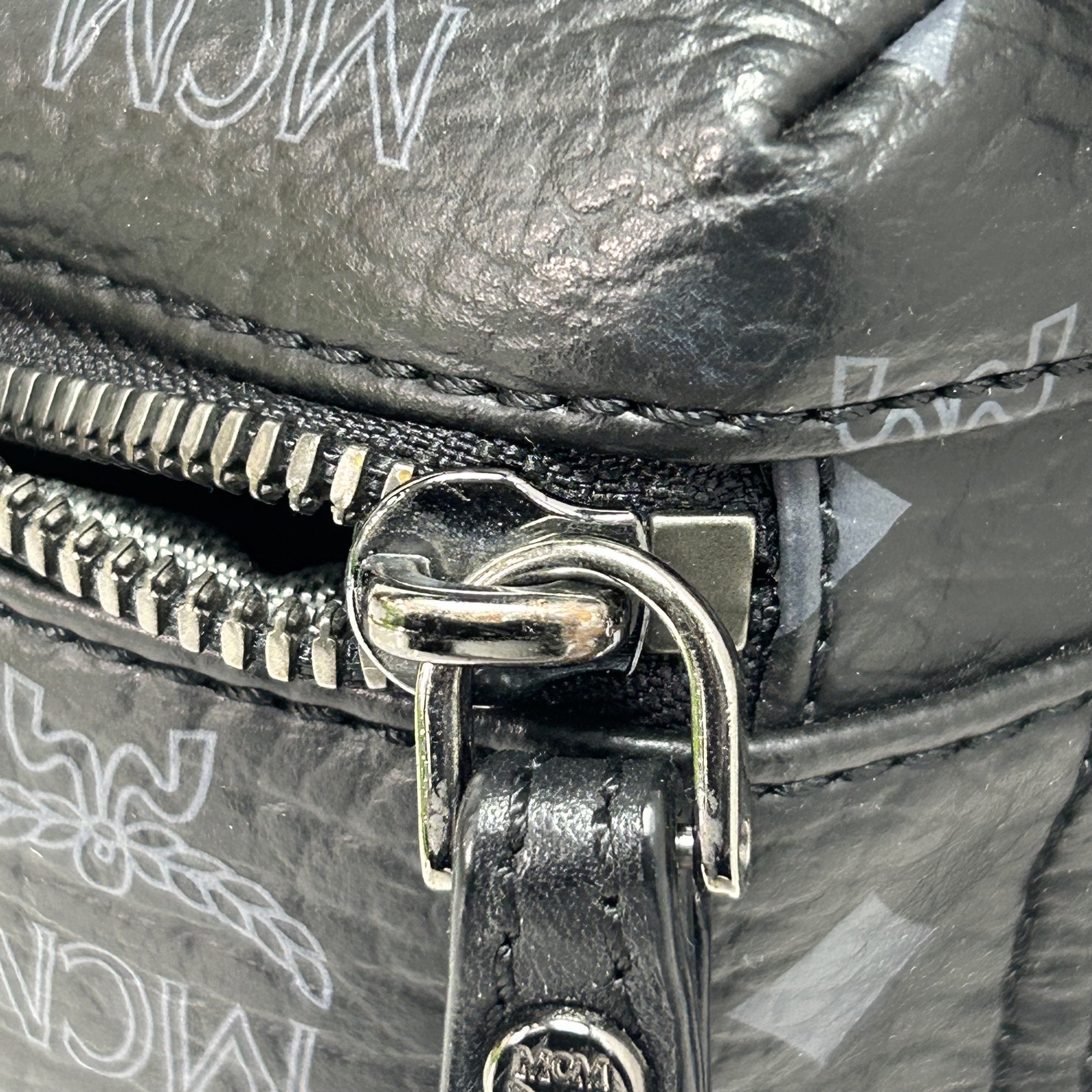 Made from black leather with embossed MCM monogram and side rivet details, this mini backpack features adjustable straps and a compact shape, perfect for trendy hands-free carry.