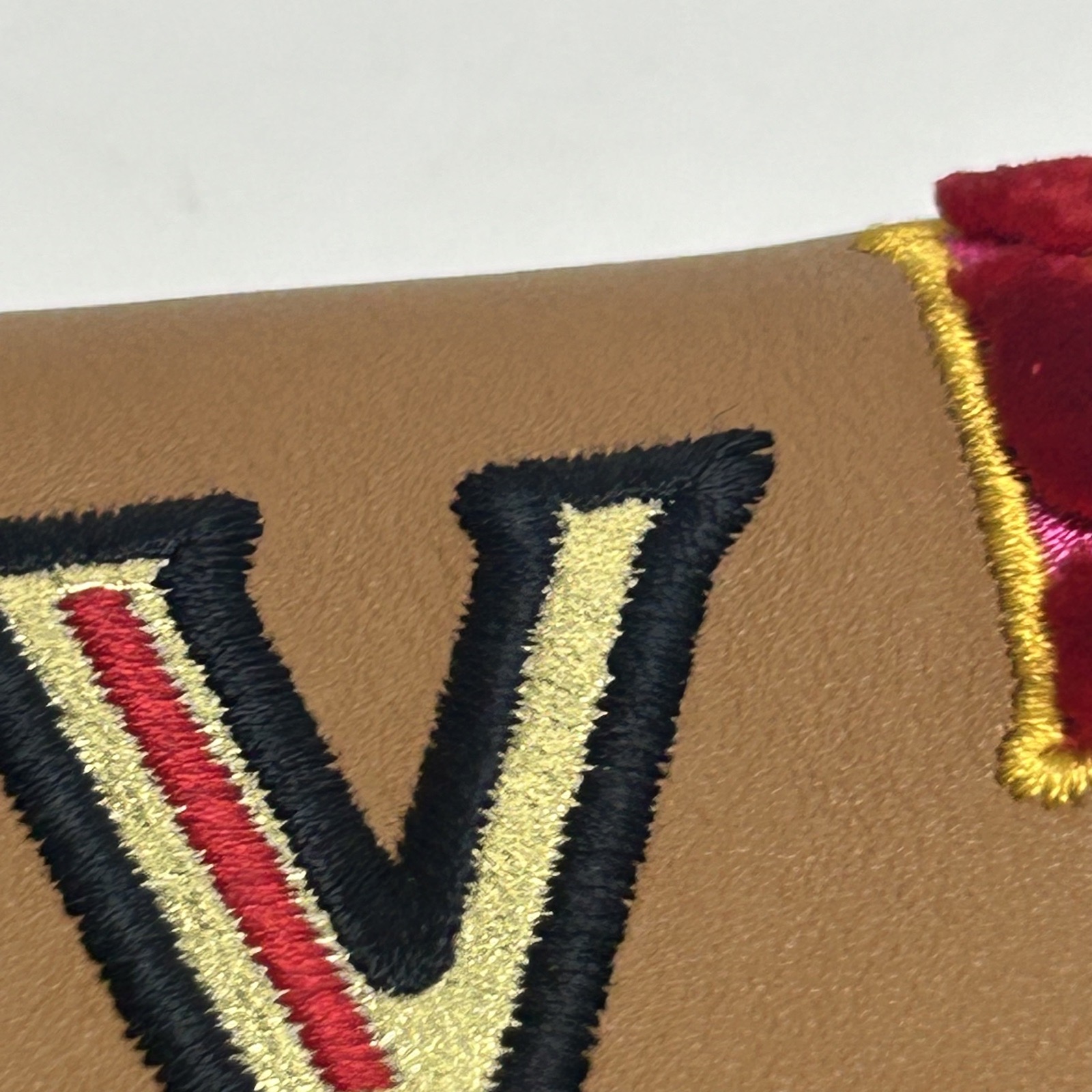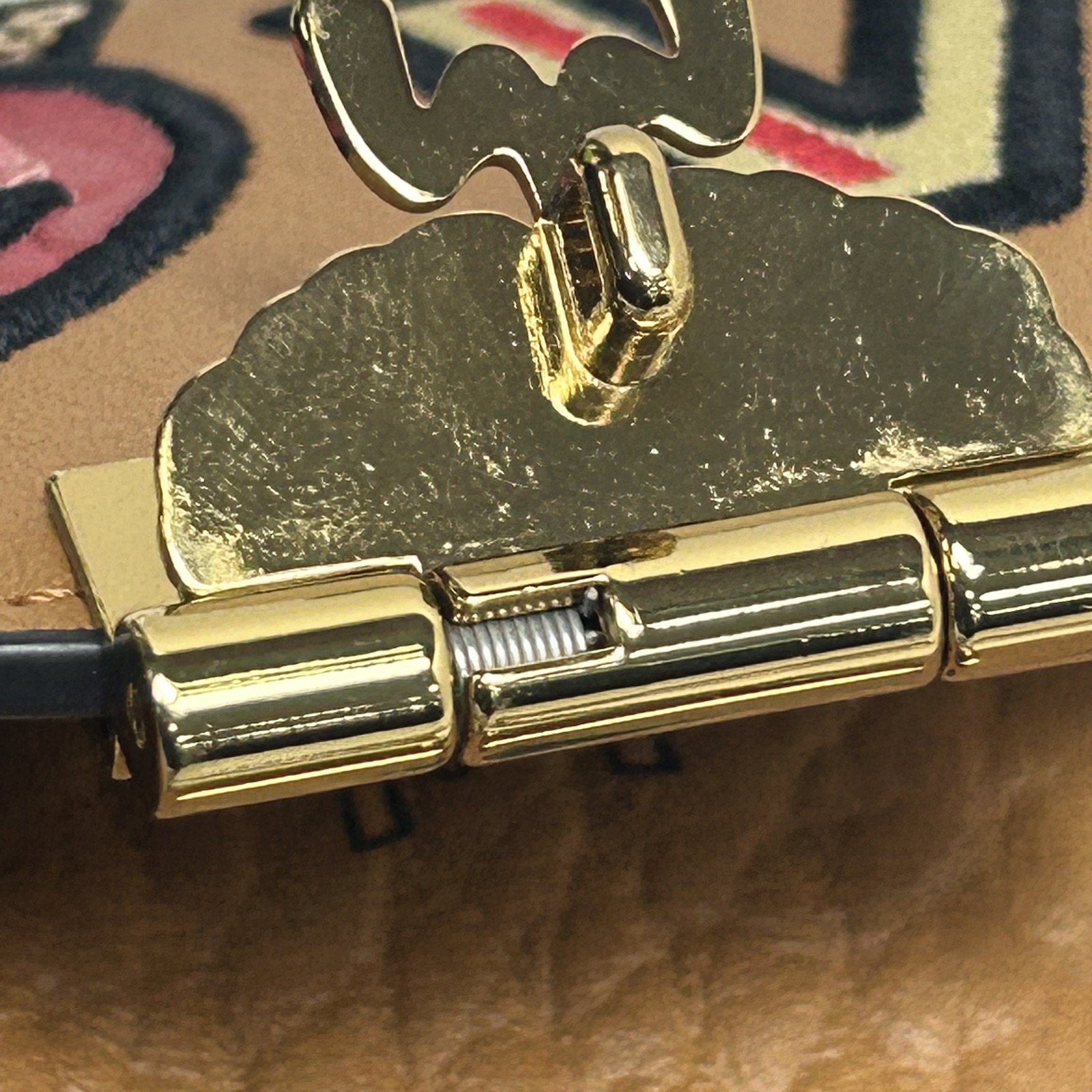 Crafted from tan leather with playful “LOVE” print and gold-tone hardware, this chain wallet features a fold-over design and detachable strap, blending whimsical charm with functional storage.