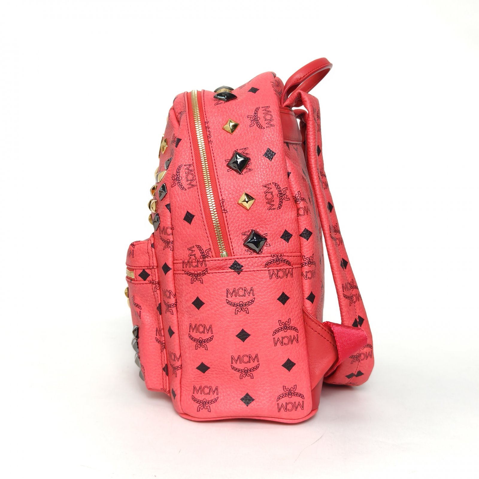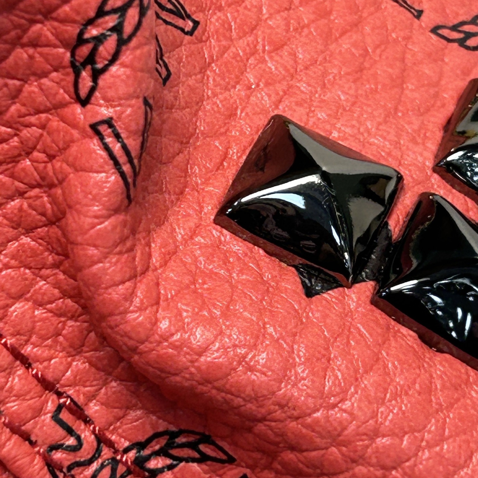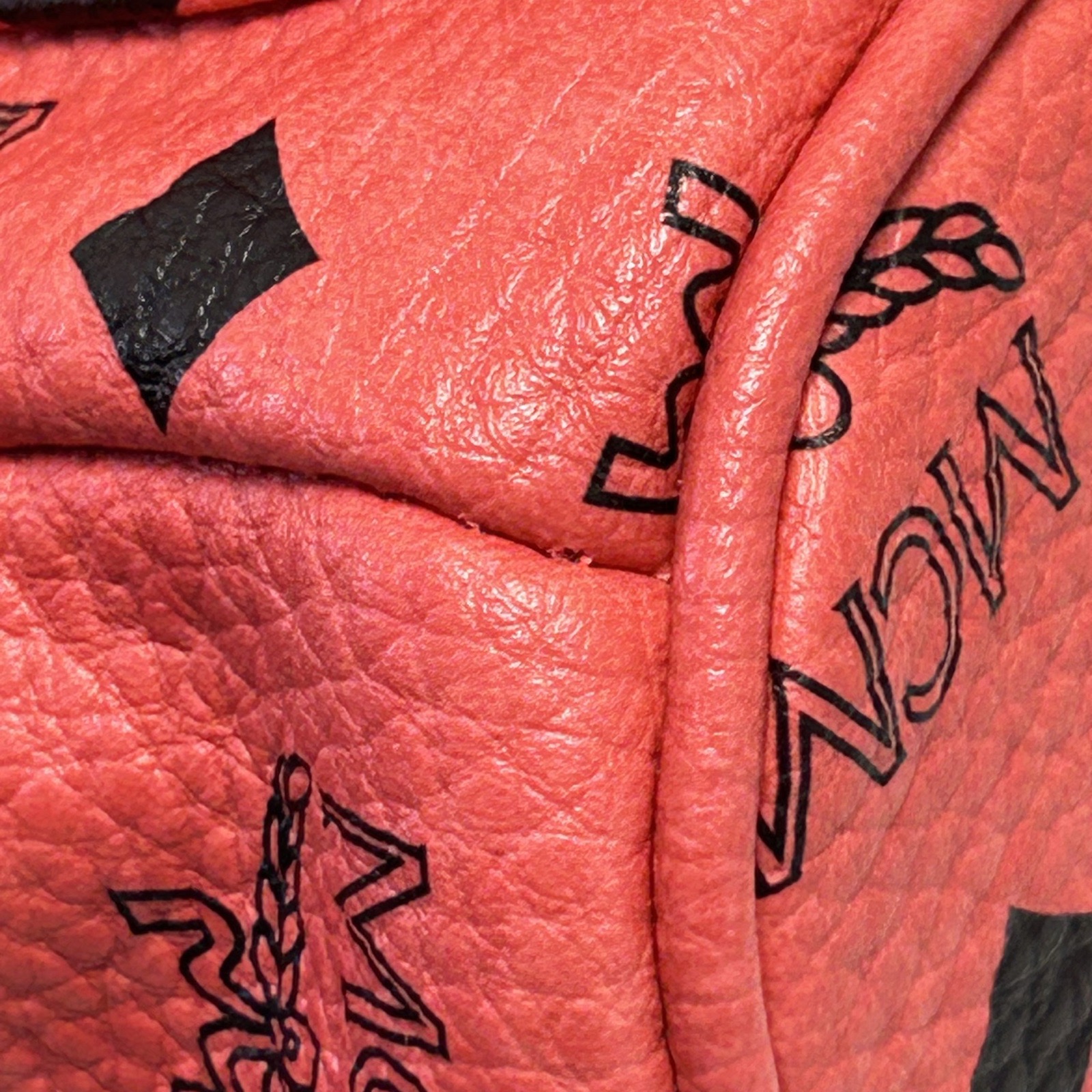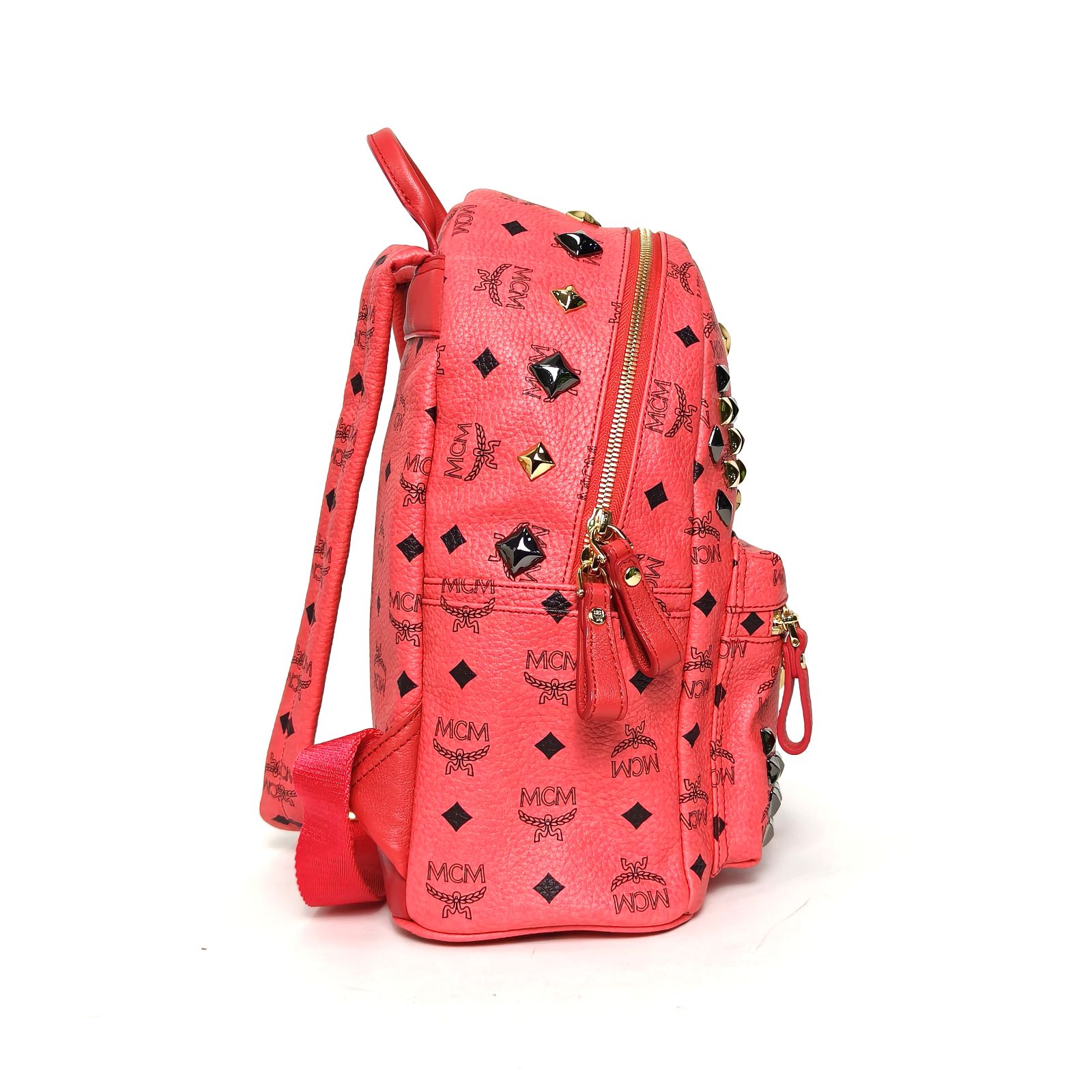 This MCM small backpack is crafted from coral red faux leather with studded detailing and iconic MCM monogram, perfect for casual luxury.