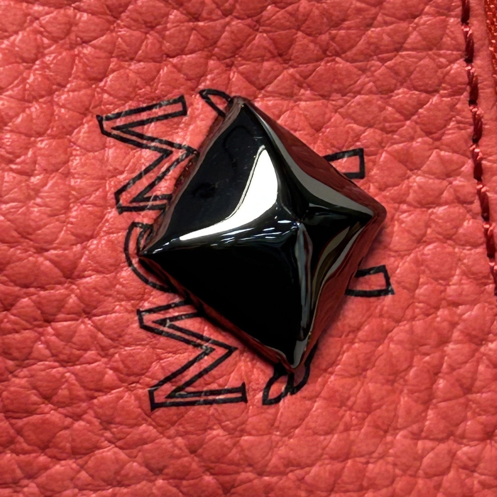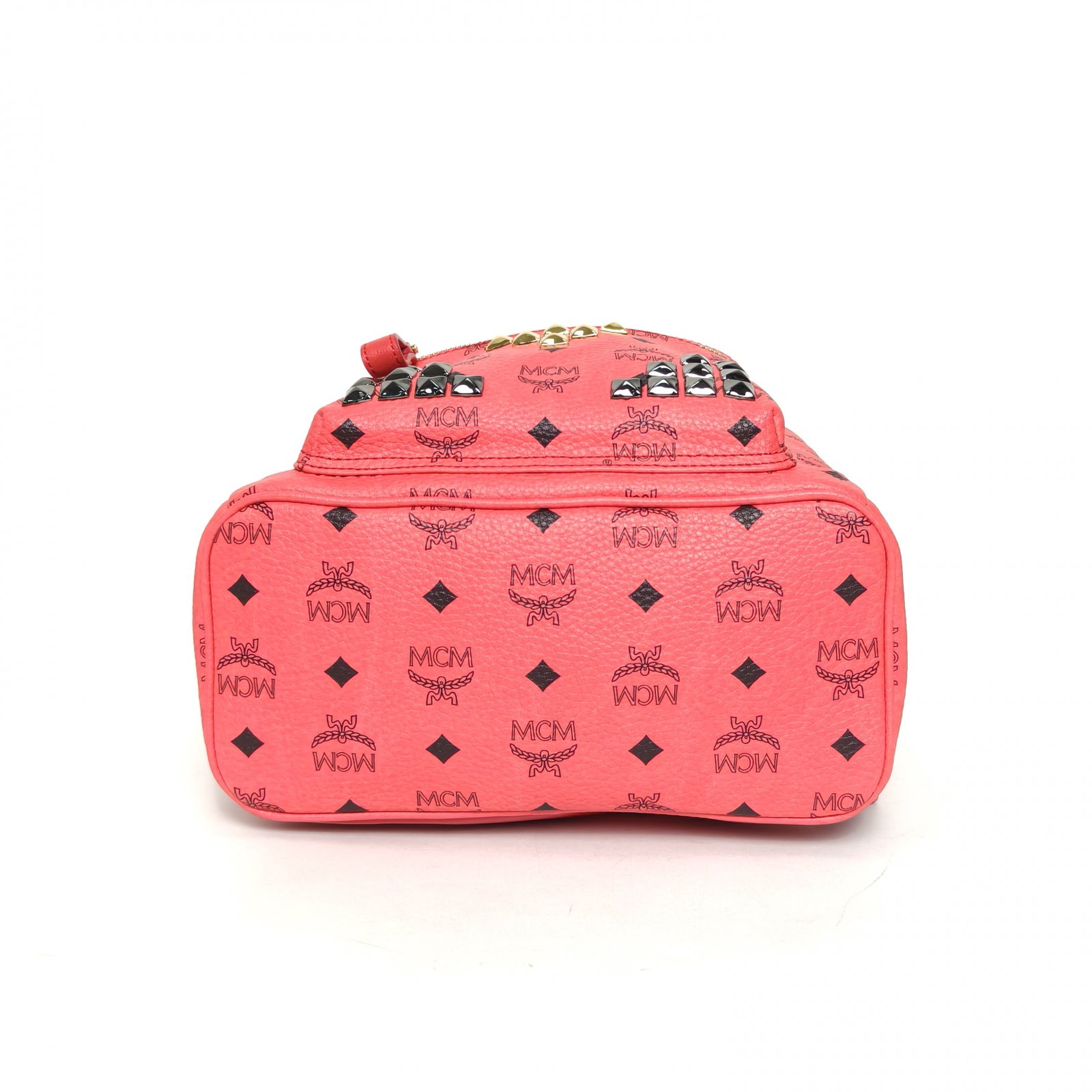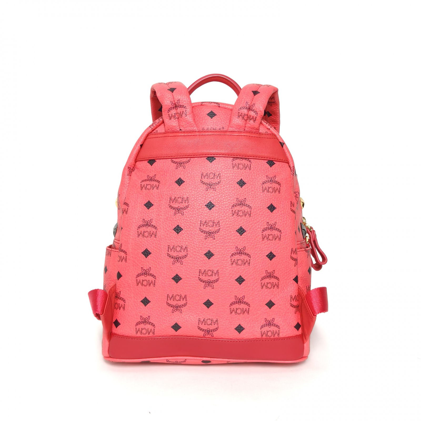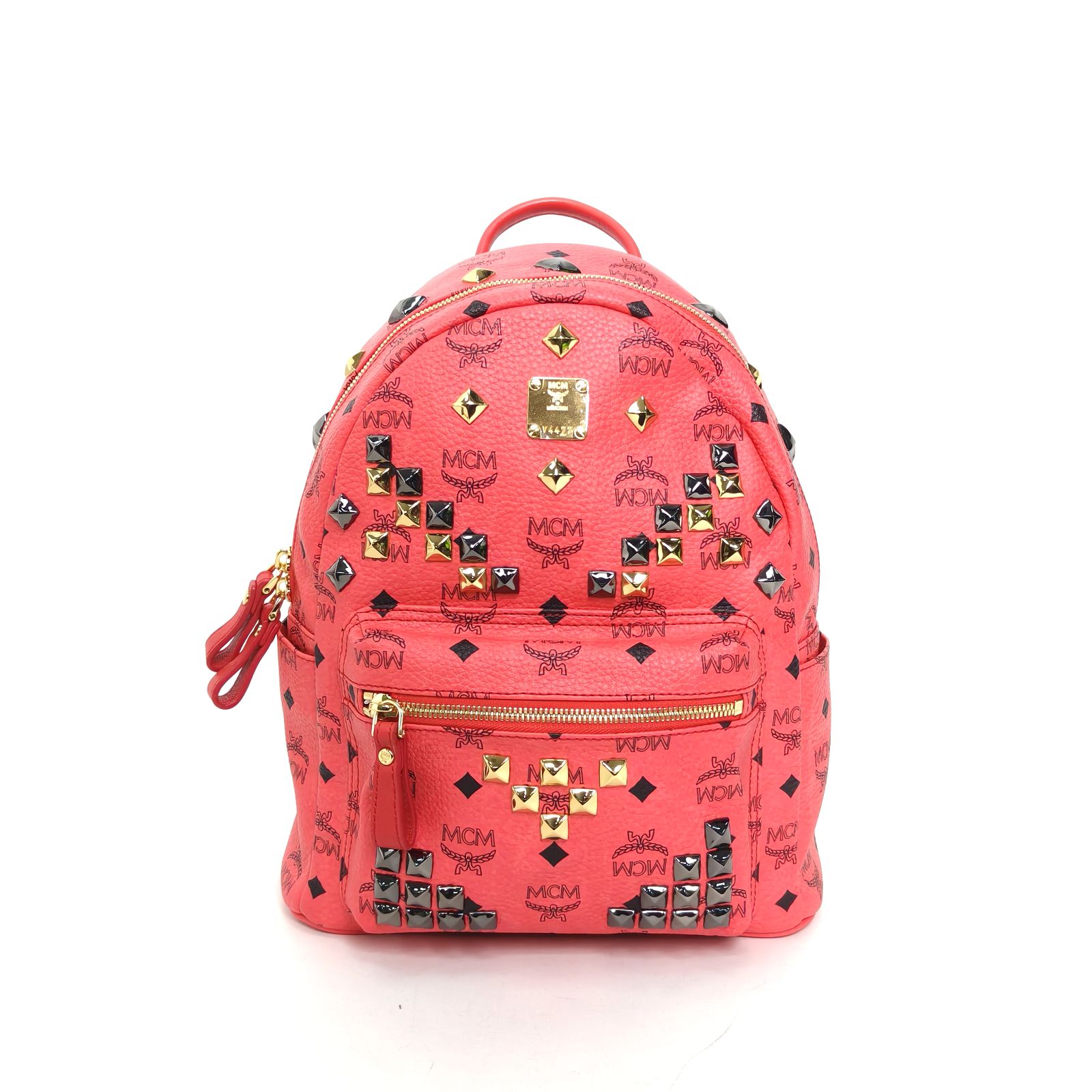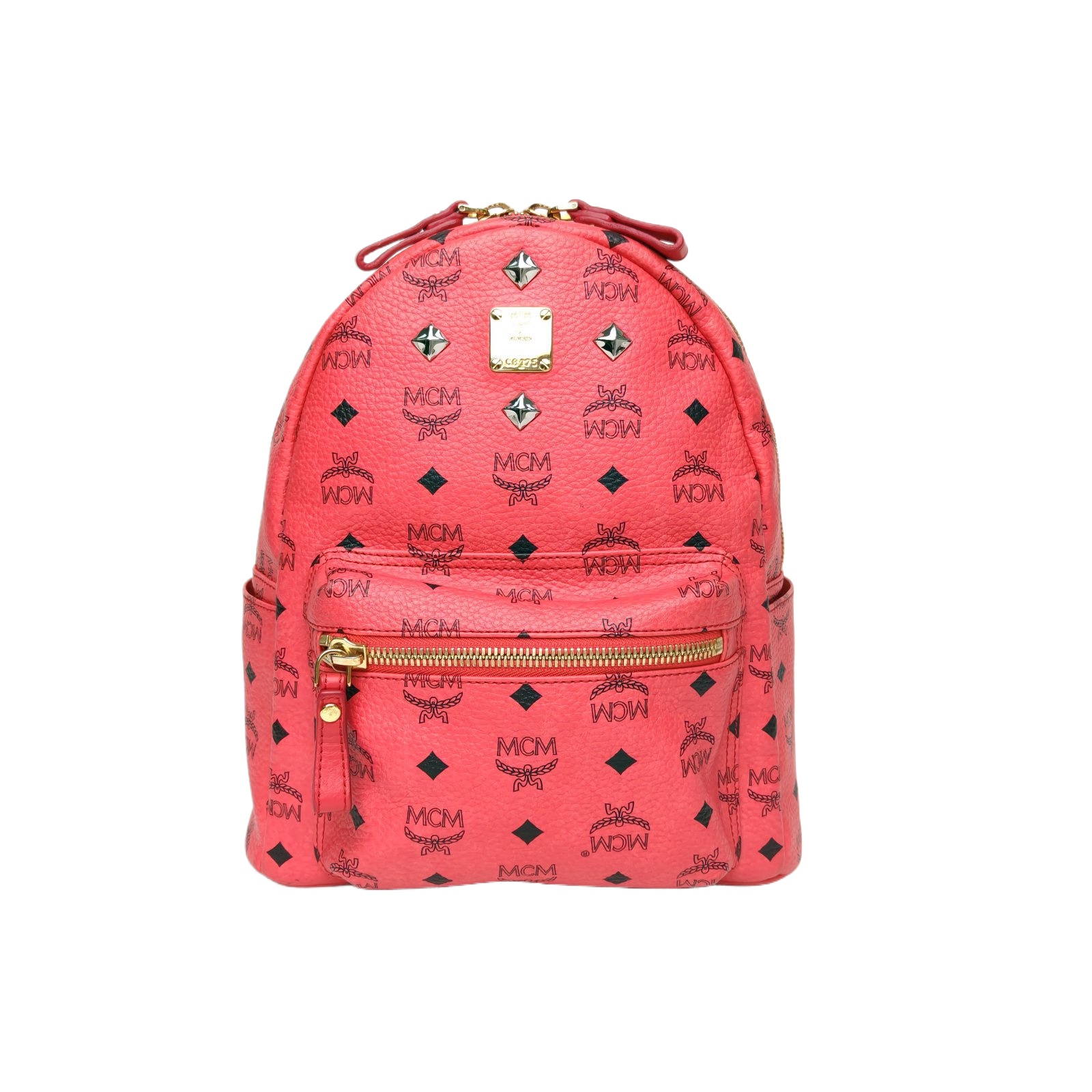 This MCM small backpack is crafted from coral red faux leather with studded detailing and iconic MCM monogram, perfect for casual luxury.