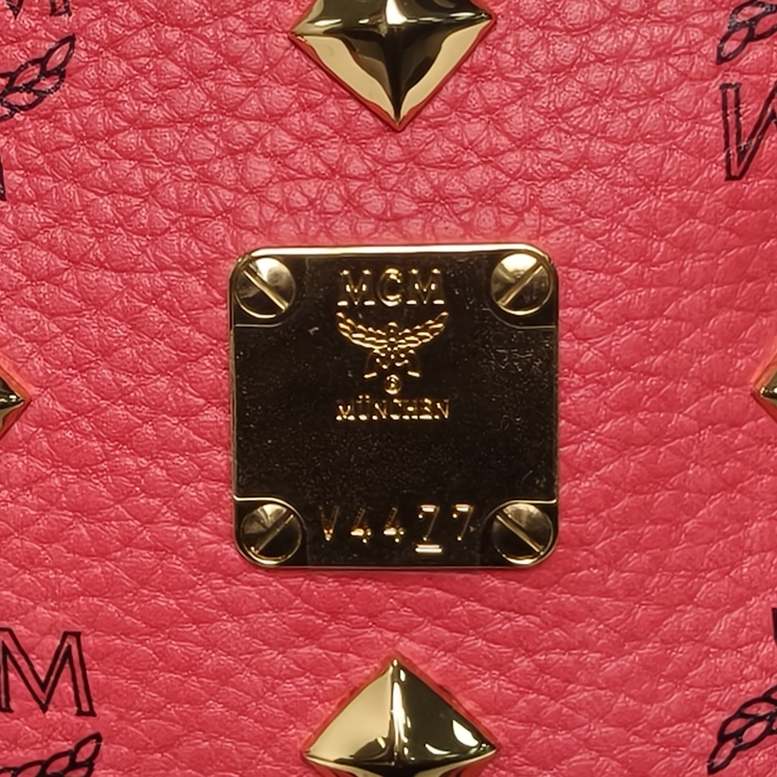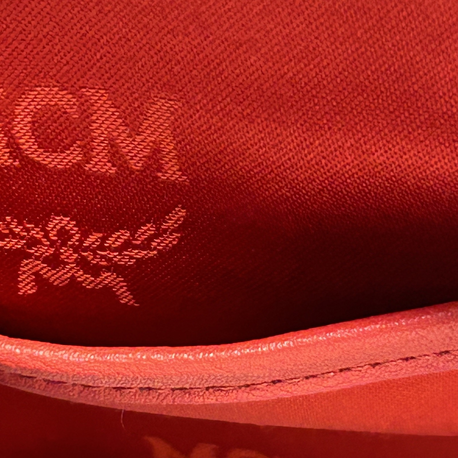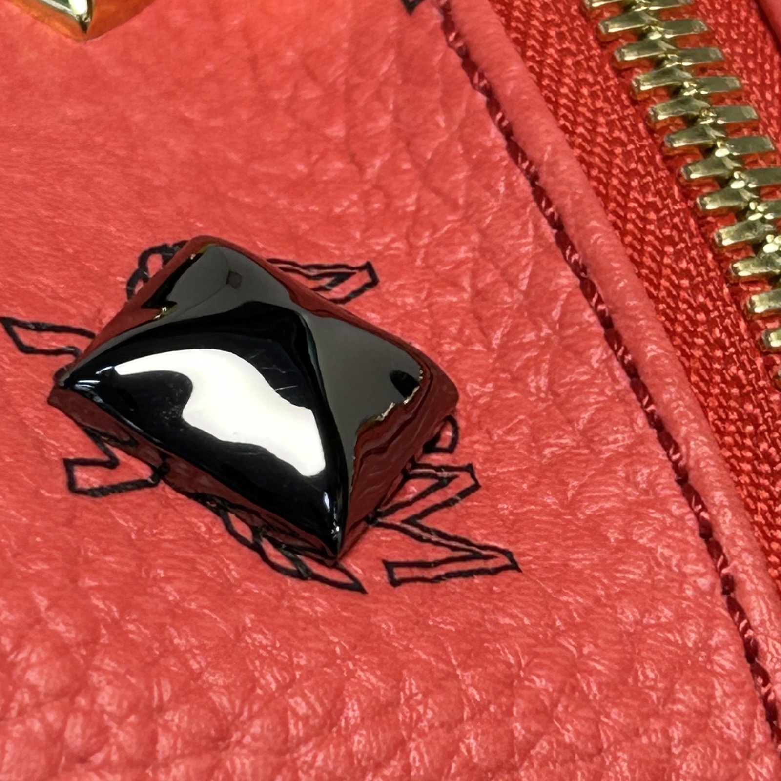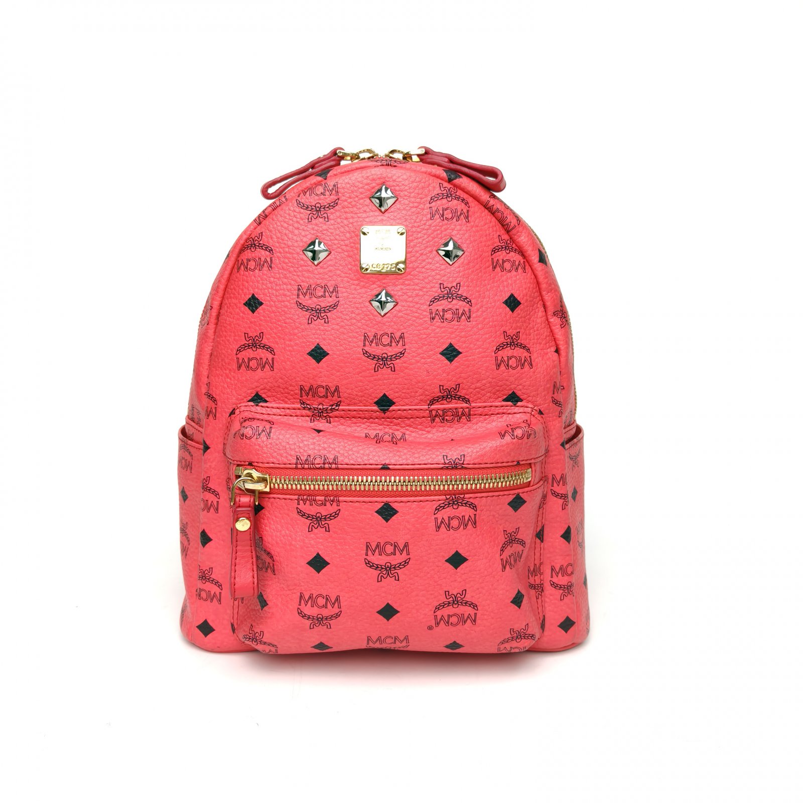 This MCM small backpack is crafted from coral red faux leather with studded detailing and iconic MCM monogram, perfect for casual luxury.