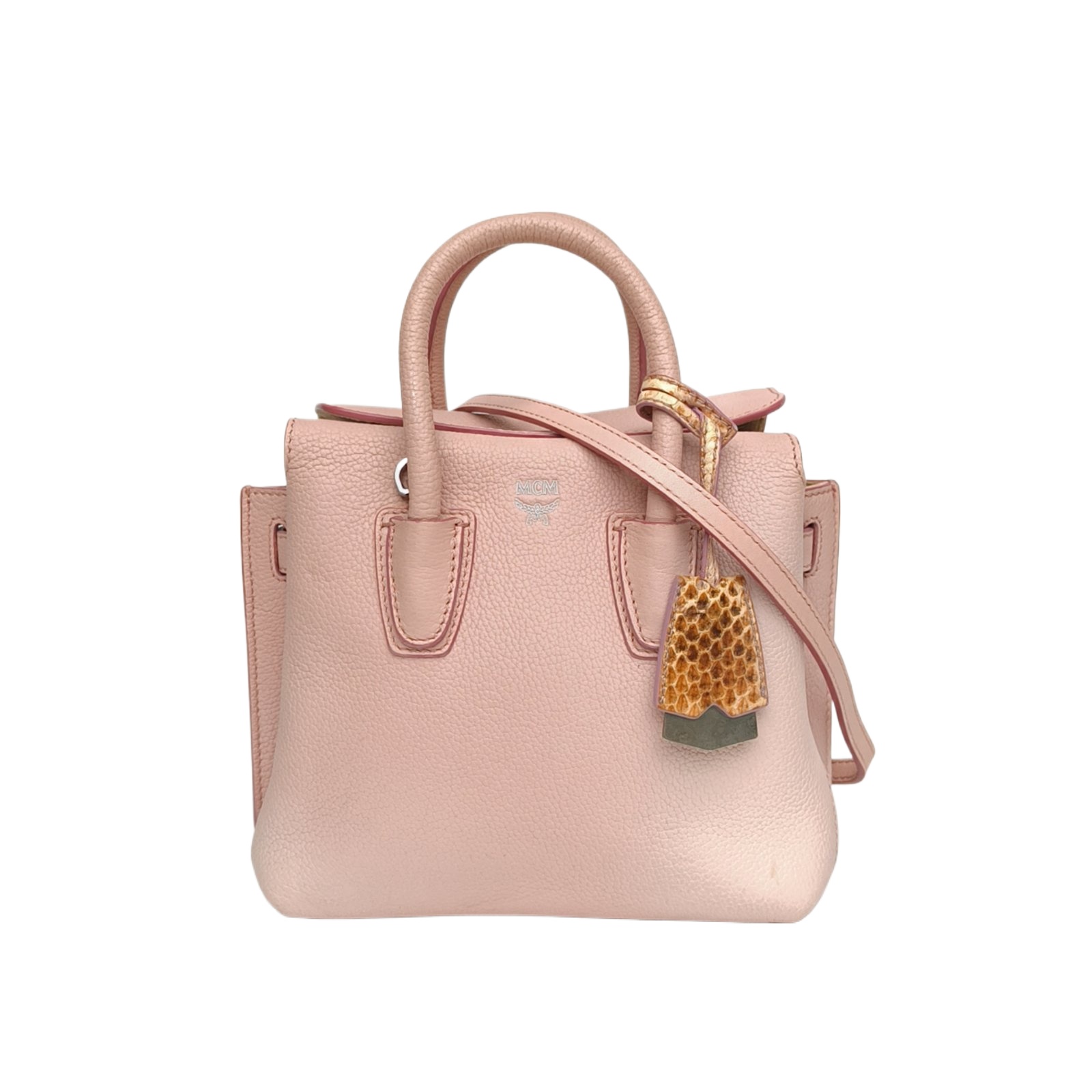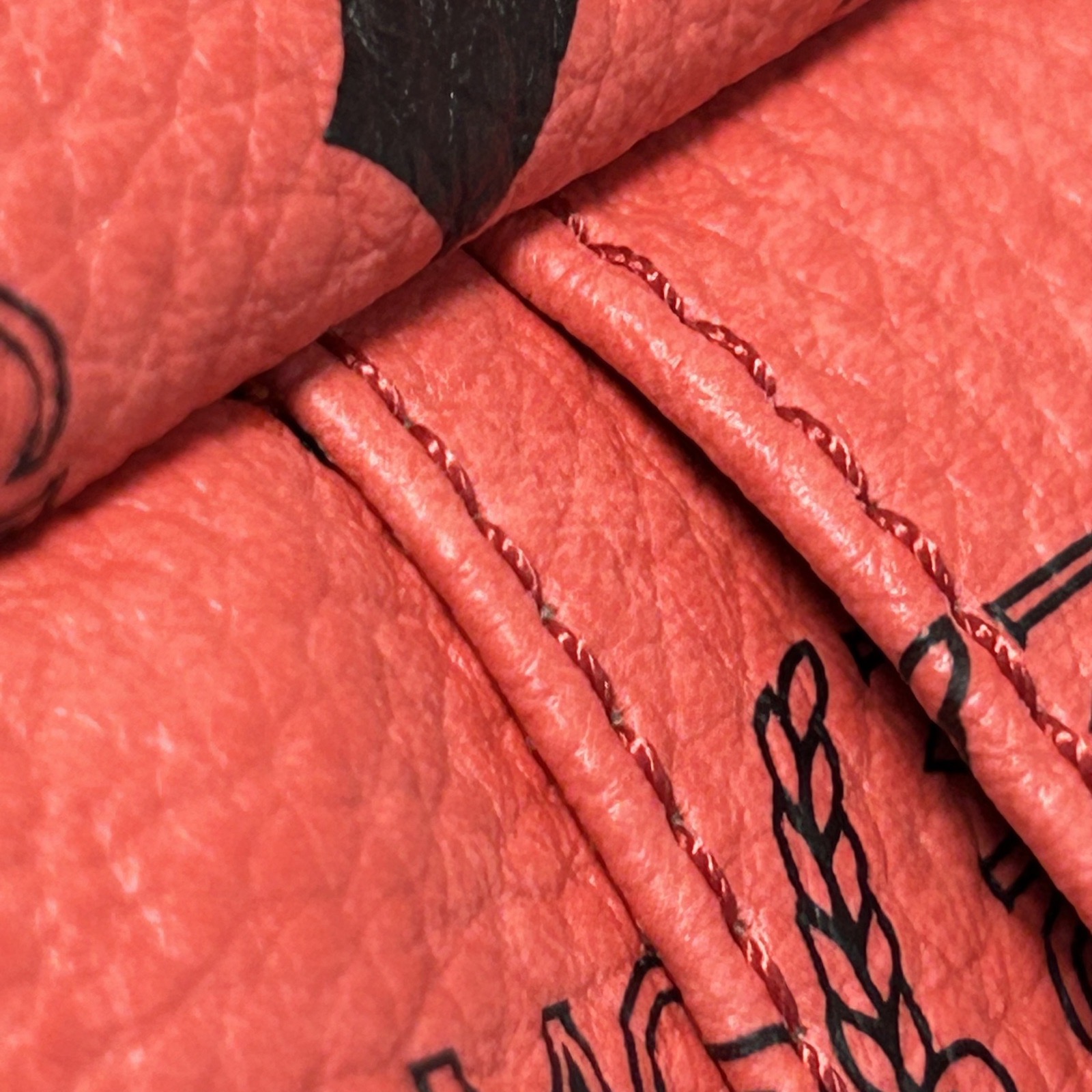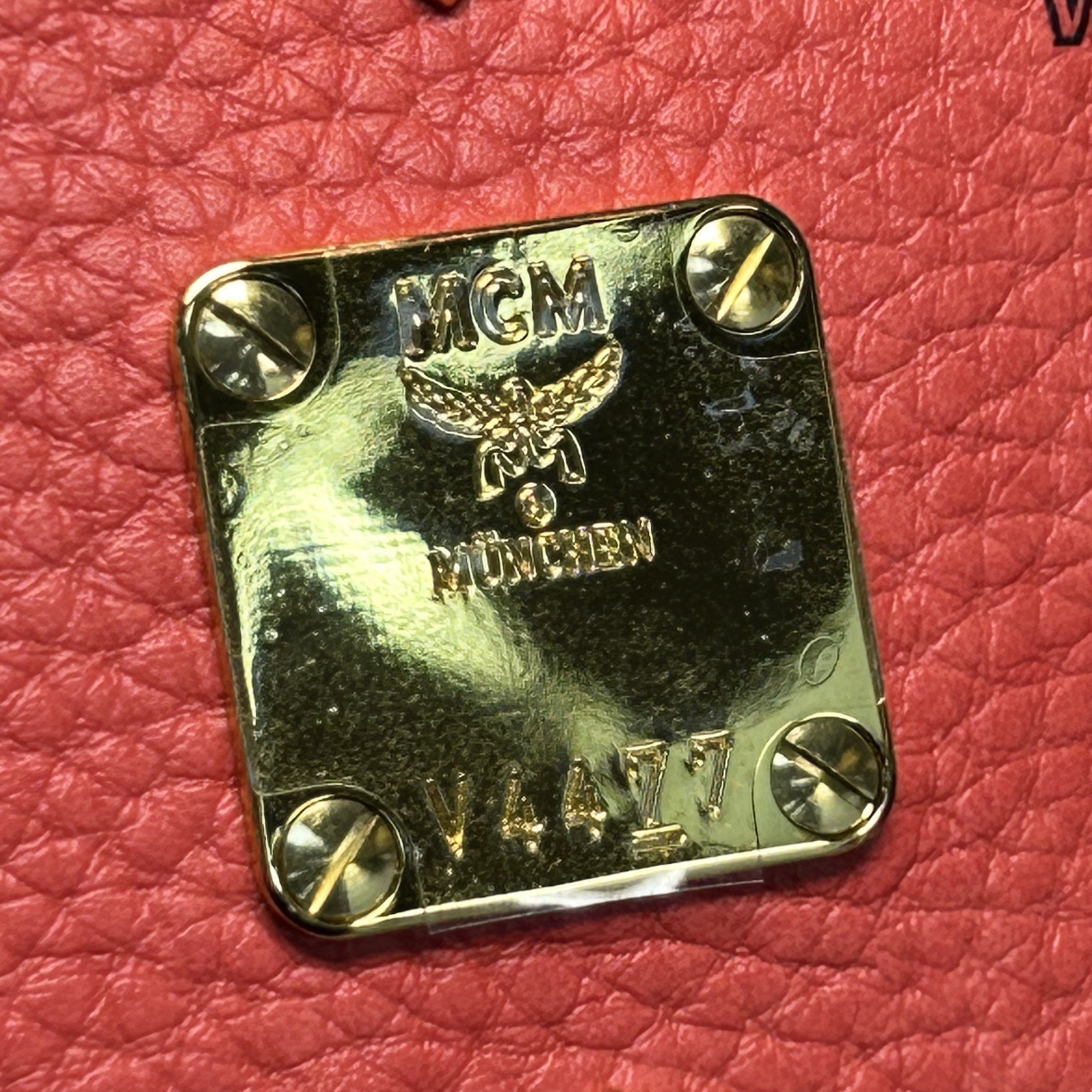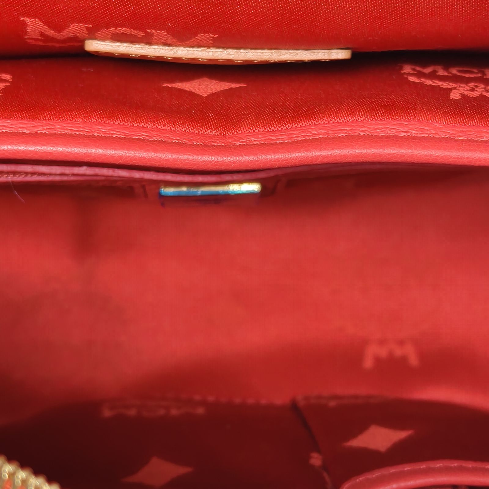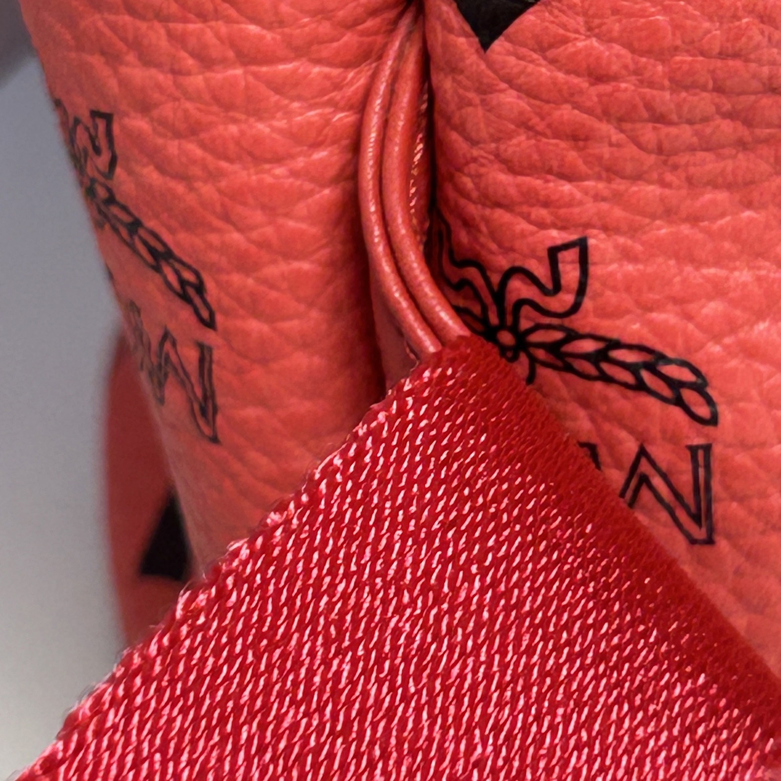 This MCM small backpack is crafted from coral red faux leather with studded detailing and iconic MCM monogram, perfect for casual luxury.