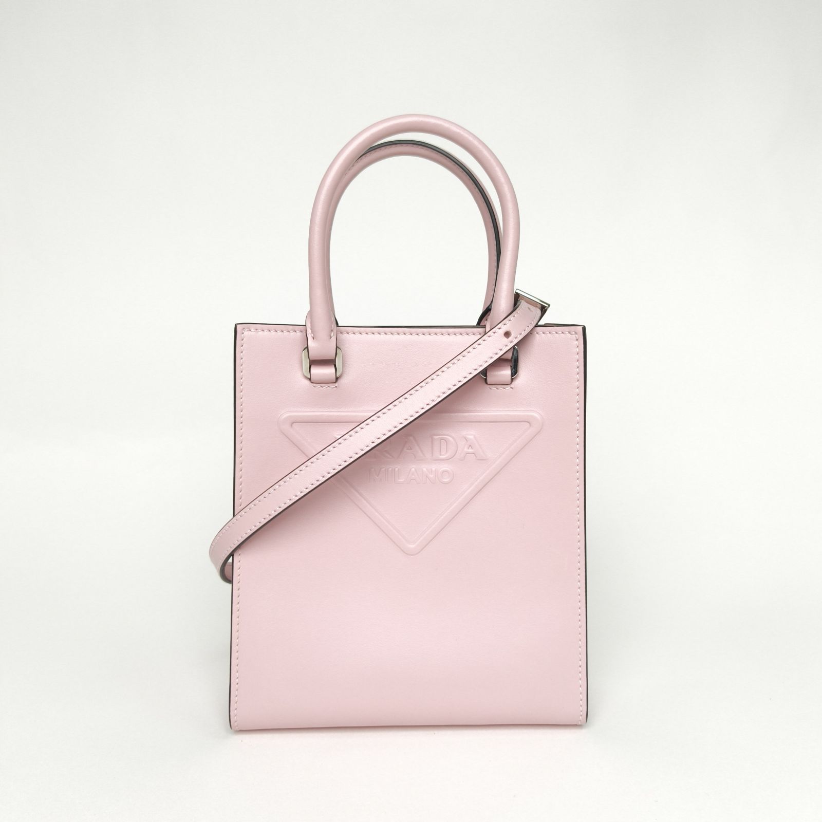 Crafted from premium leather with iconic PRADA logo, this tote mini bag features a top handle and detachable strap, a stylish daily luxury piece.