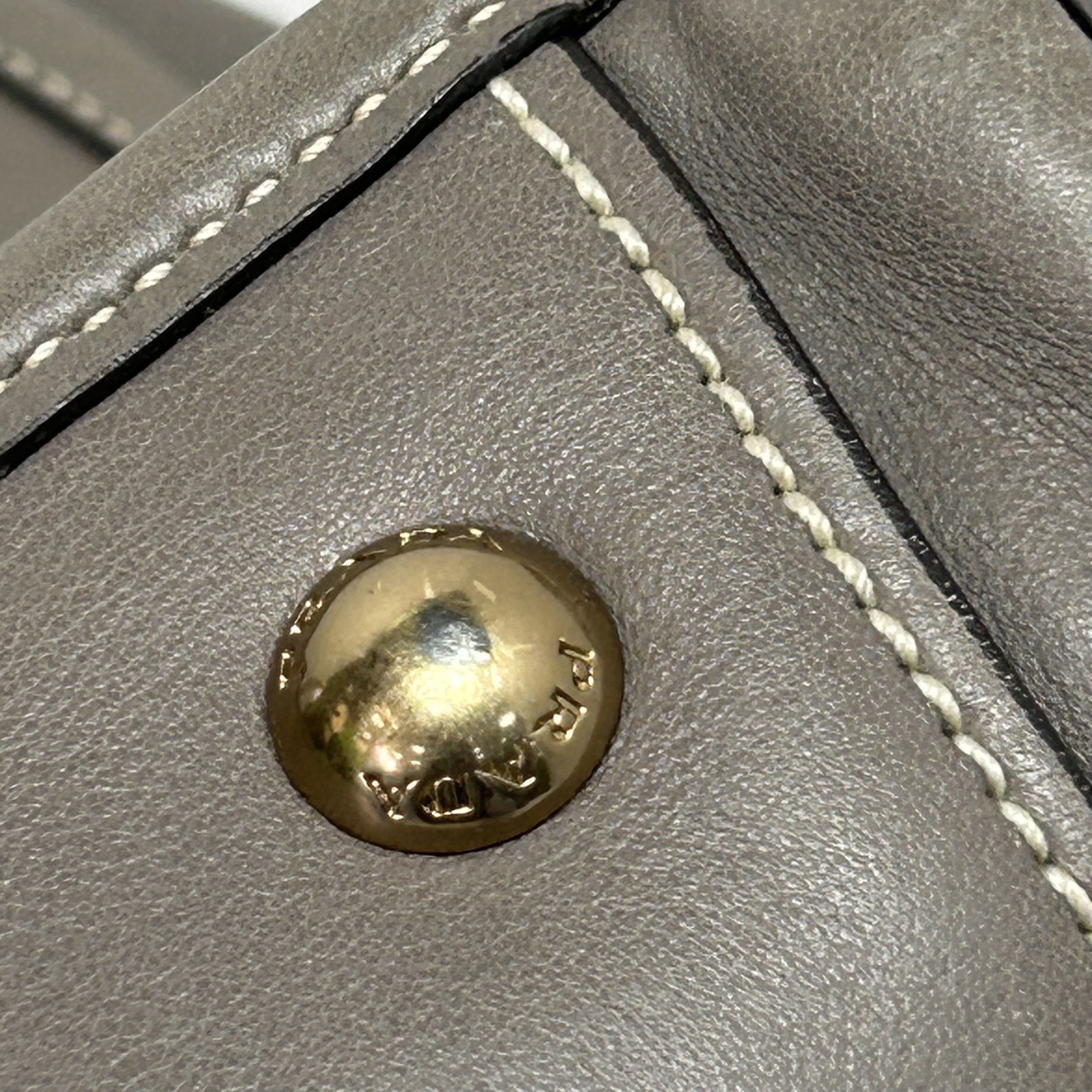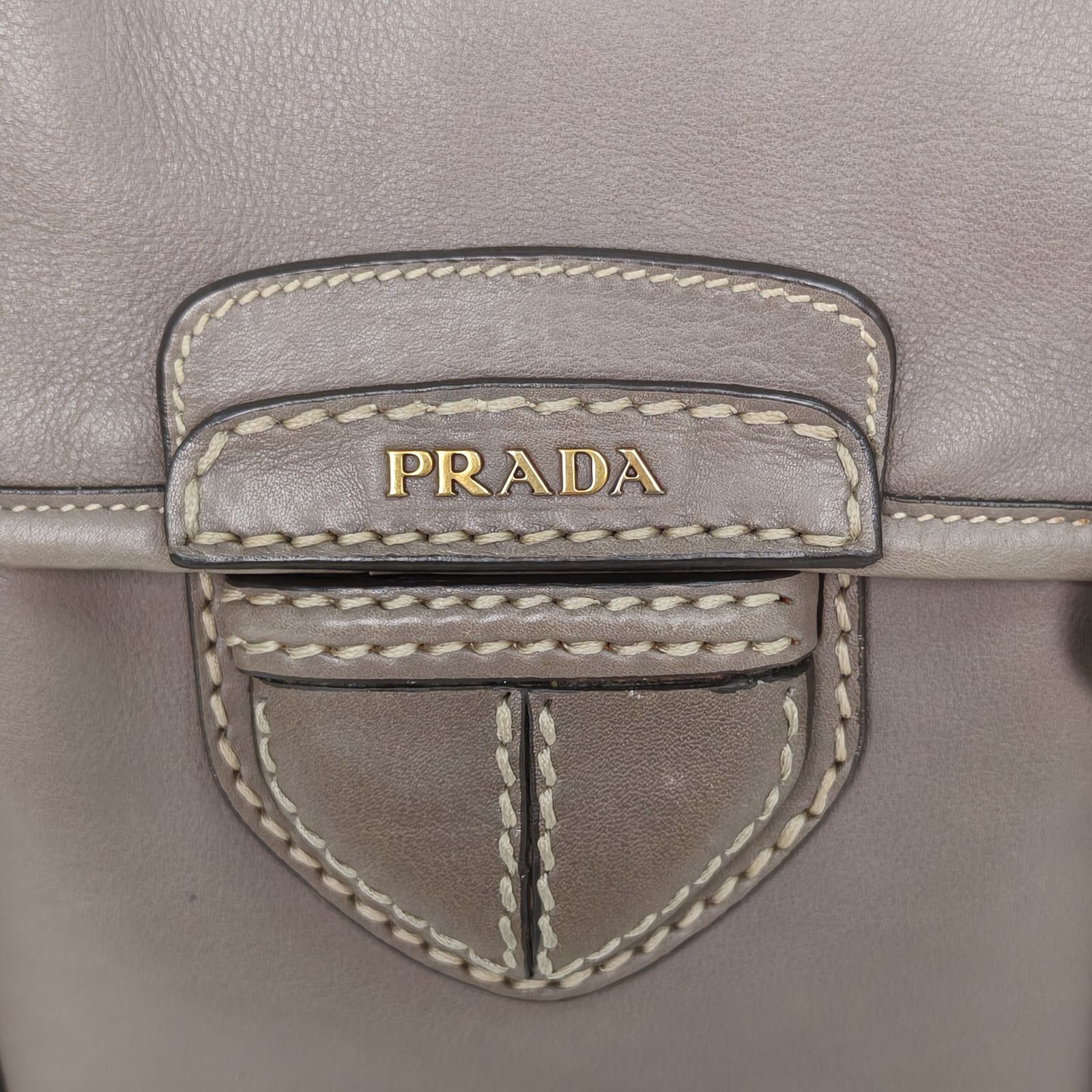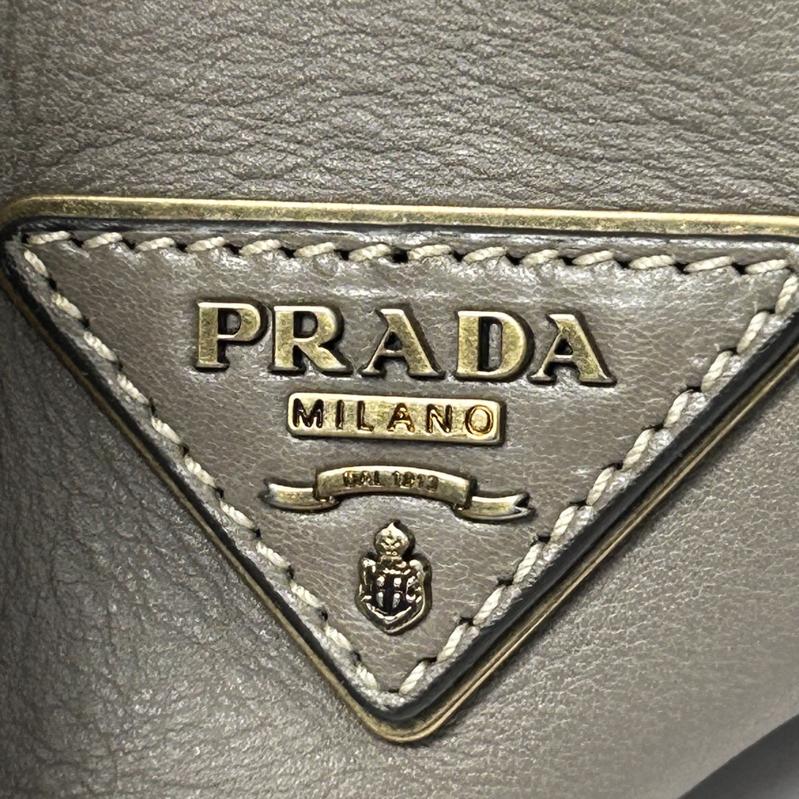 This vintage handbag is crafted from gray leather with iconic Prada logo hardware, featuring top handles, a rare retro collectible.