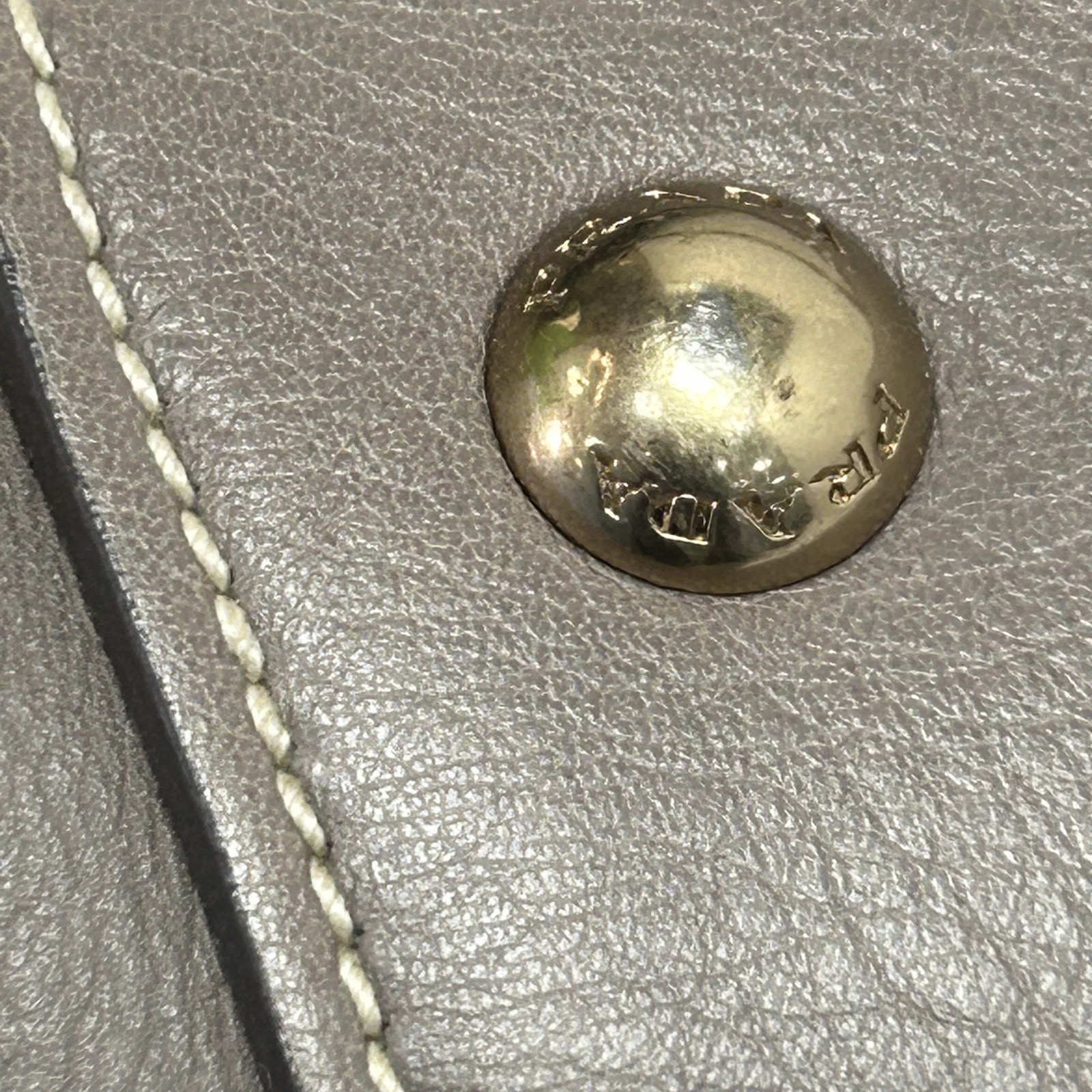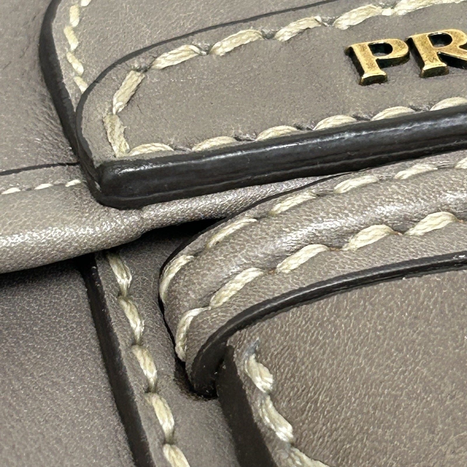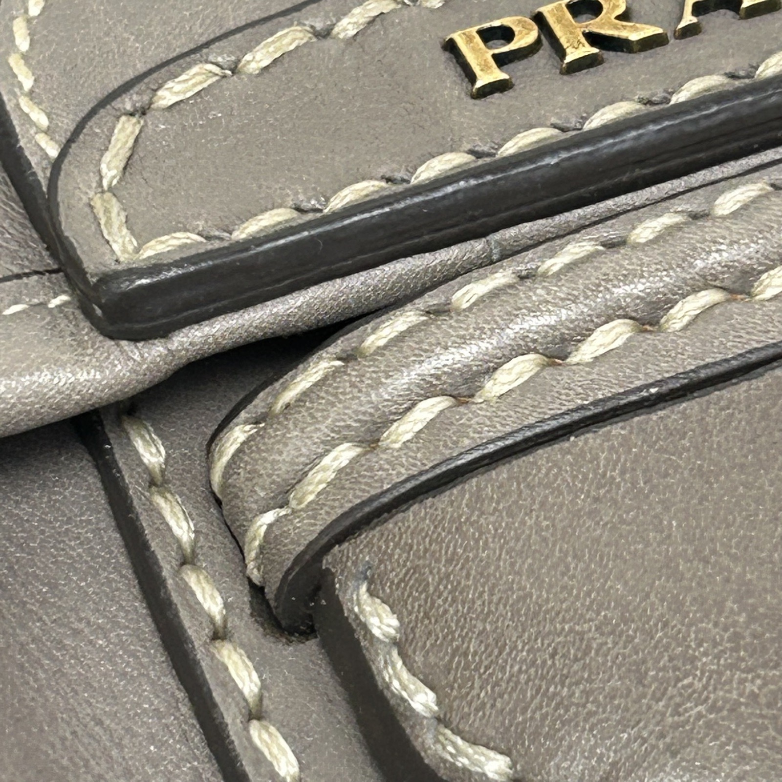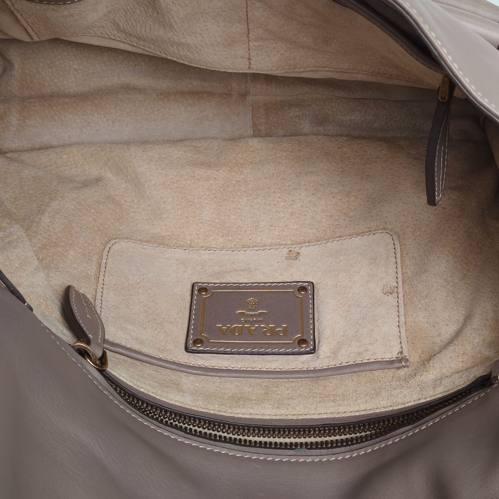 This vintage handbag is crafted from gray leather with iconic Prada logo hardware, featuring top handles, a rare retro collectible.