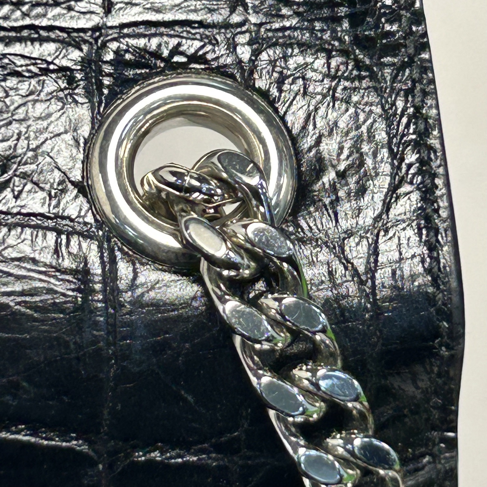 Embodying A sleek and edgy luxury icon, the Saint Laurent Kate Medium is crafted from black crocodile-embossed leather with polished silver hardware and a signature tassel charm. The structured silhouette and chain strap make it a perfect accessory for evening and formal occasions.