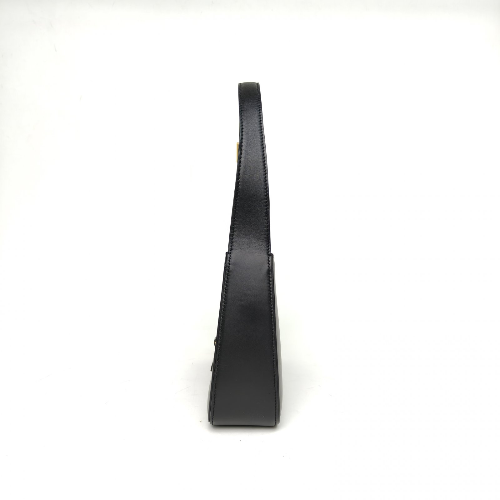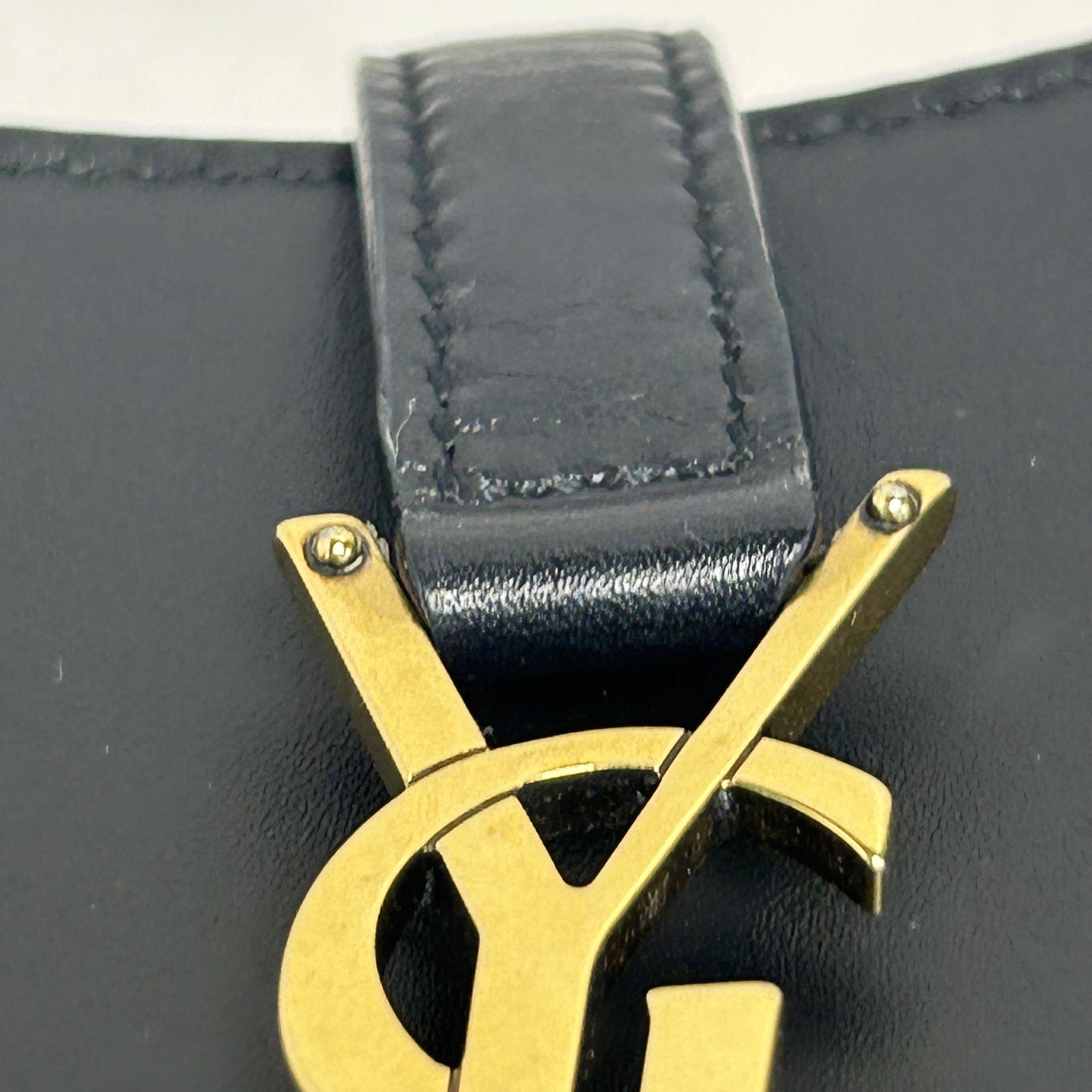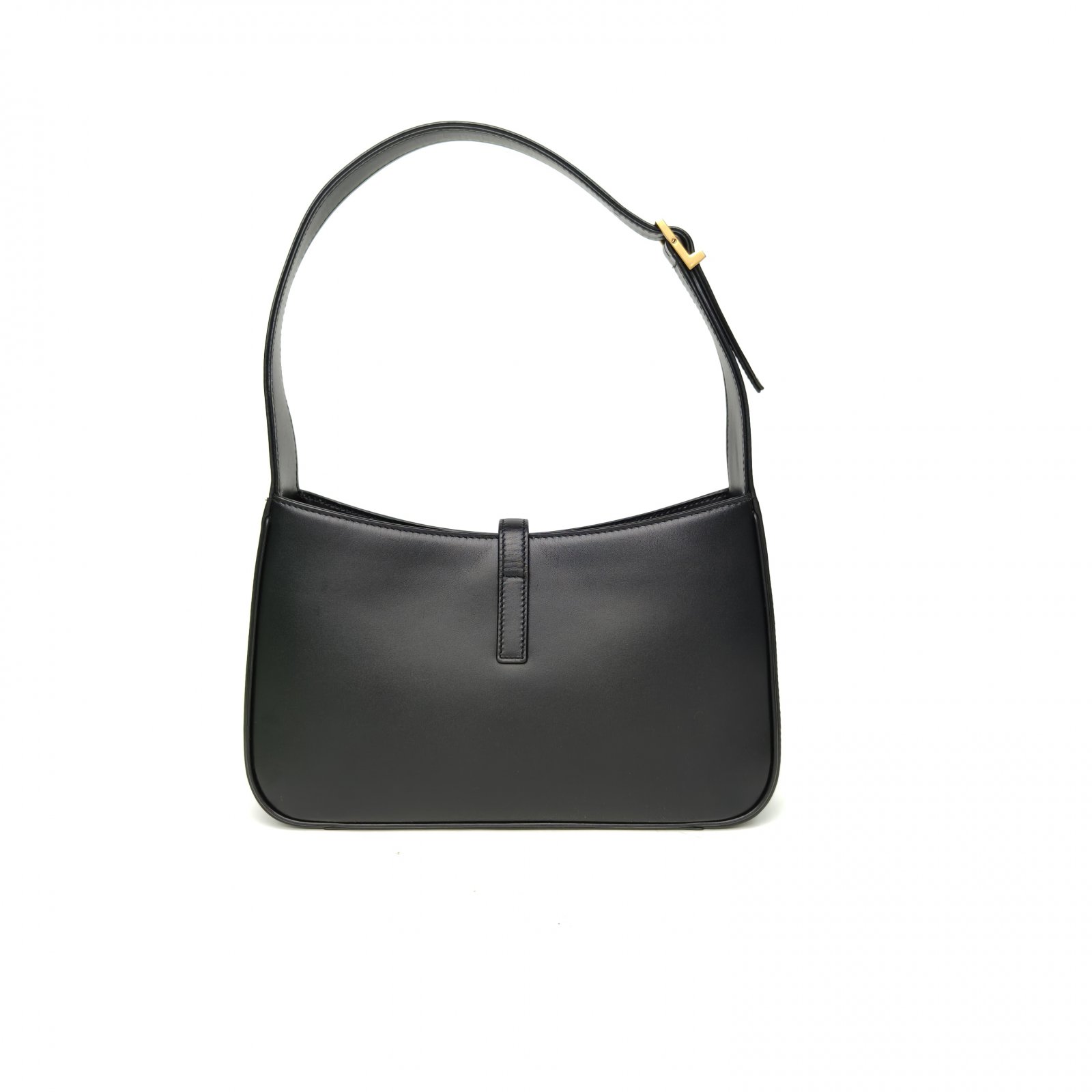 This Saint Laurent LE 5 À 7 small 23cm hobo bag is crafted from black leather with gold-tone hardware, featuring the iconic YSL logo and adjustable shoulder strap.