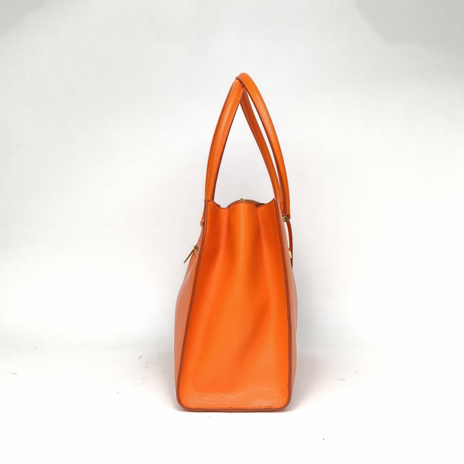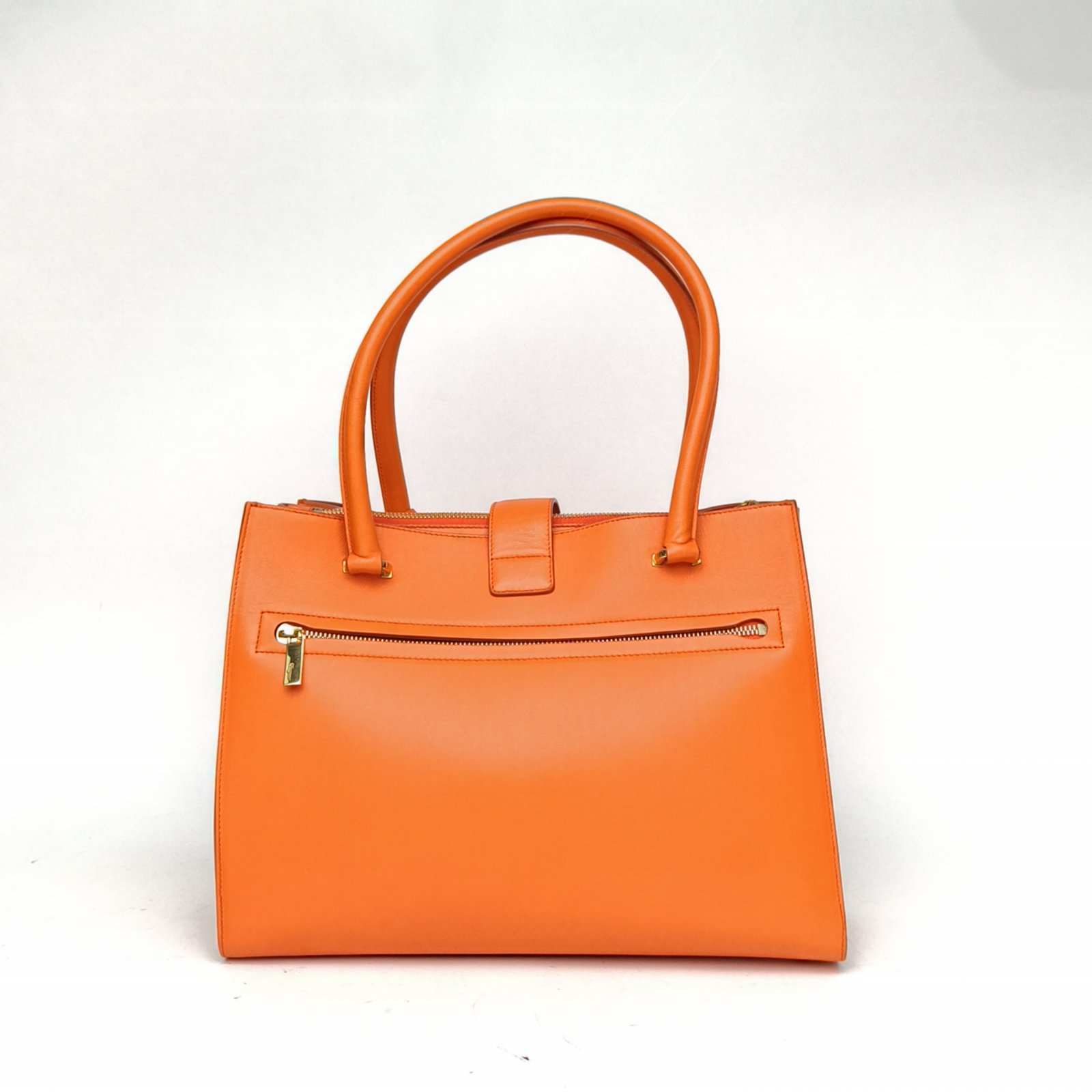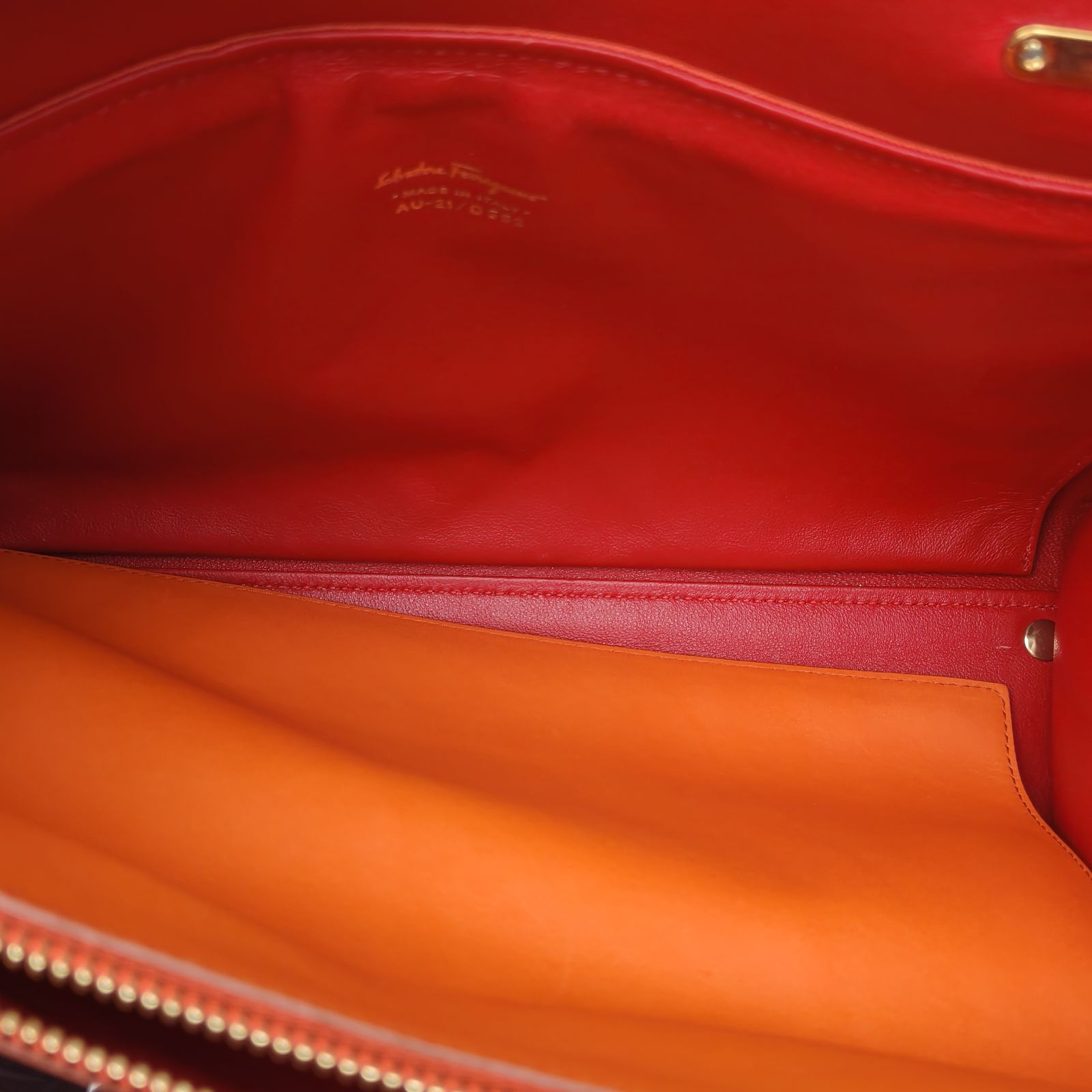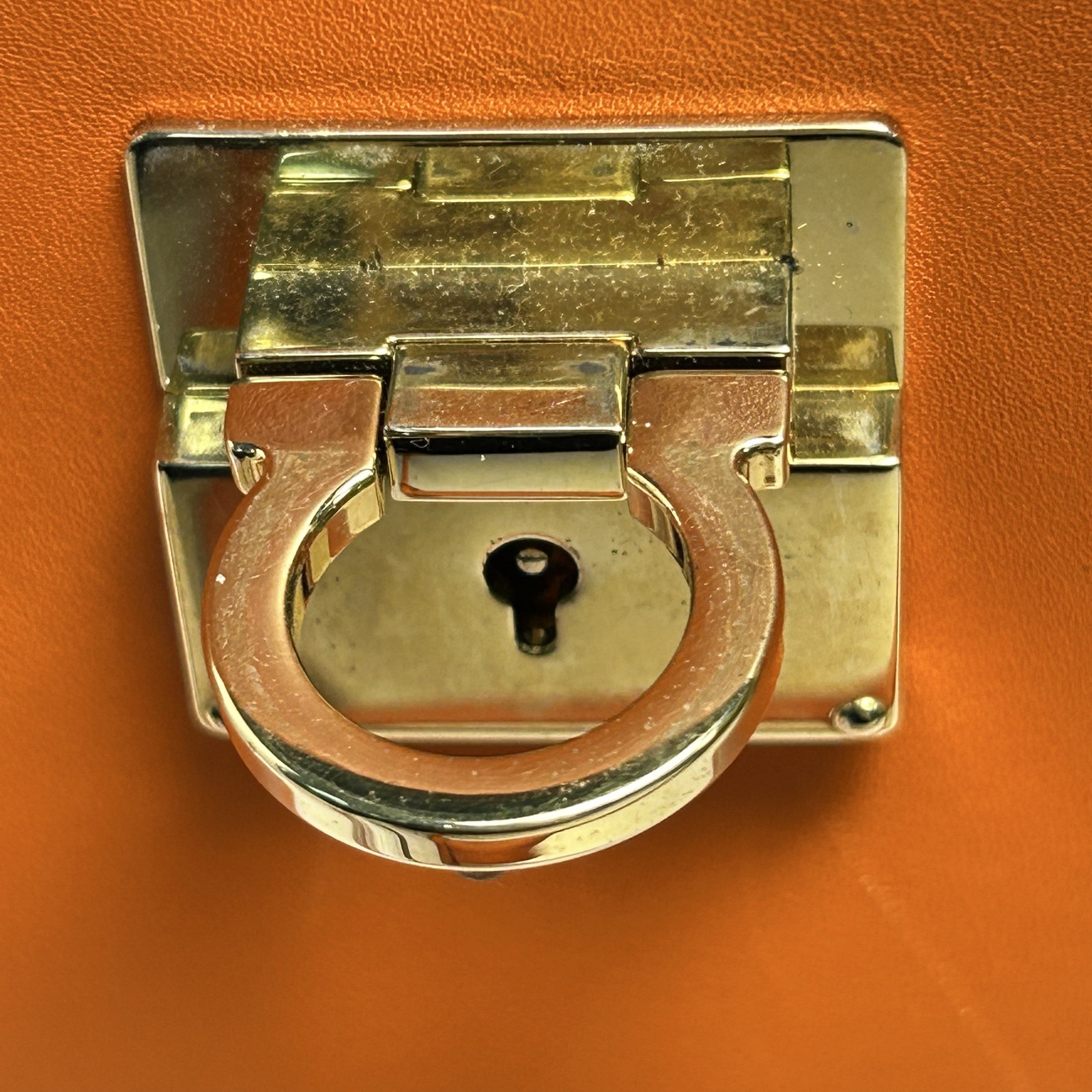 Embodying A bright and cheerful orange leather tote from Salvatore Ferragamo, featuring the brand’s iconic gancini hardware and structured silhouette. Perfect for everyday use, this piece combines Italian craftsmanship with vibrant style.