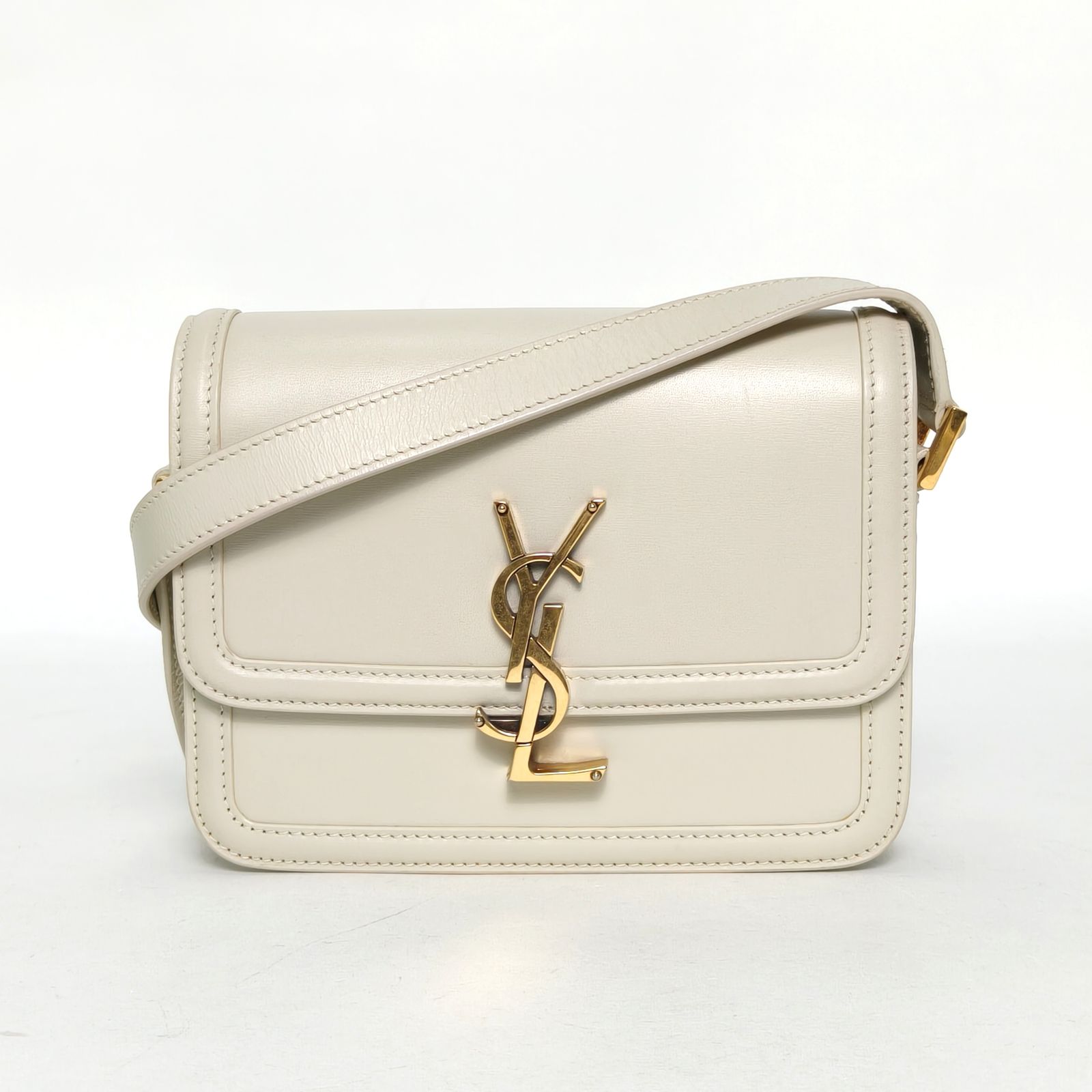 Crafted from off-white leather with signature YSL turn-lock, this Solferino Box mini bag features a structured silhouette and adjustable strap, embodying YSL’s minimalist, modern luxury.